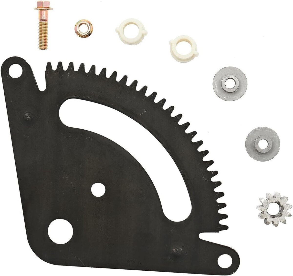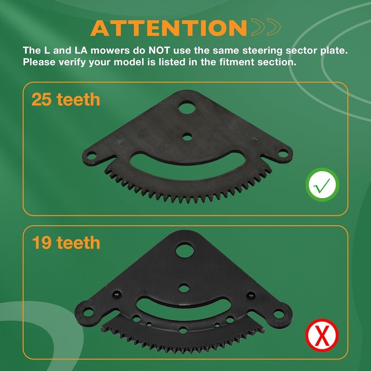 ?ATTENTION?The package includes 1 x set sector plate, pinion gear, nut and bolt, 2 x set metal bushing, 2 x plastic bushing as pictures show.The L and LA mowers do NOT use the same steering sector plate