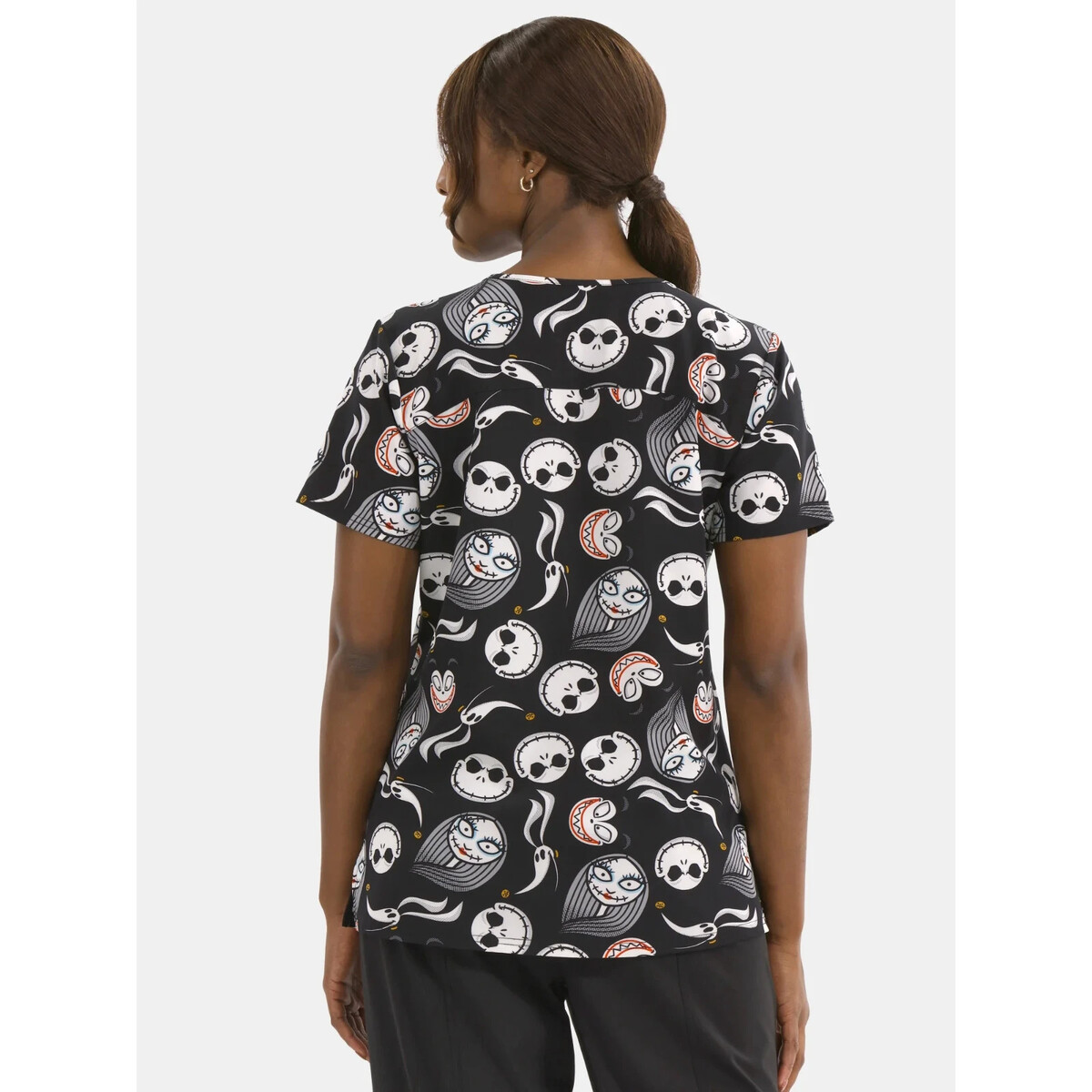 Bring some spooky fun to your everyday shift with the Nightmare Before Christmas Graphic Scrub Top! This short-sleeved, V-neck scrub top features an allover print of Jack Skellington, Sally and Zero the ghost dog?perfect for showing off your Halloween spirit or year-round love for the Pumpkin King. With convenient welt pockets and a comfy fit that moves with you from task to task, this Nightmare Before Christmas scrub top for women?s is a professional and perfect pick for long shifts and everyday wear.
