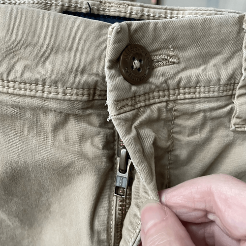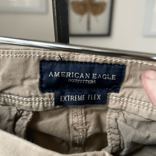 American Eagle slim khaki pants, cotton elastane blend. Flat front. 30 inch waist and the tag size says 34 inch inseam but these have been washed and the inseam shrink which is typical for this brand and it currently measures at 30.5 inches.