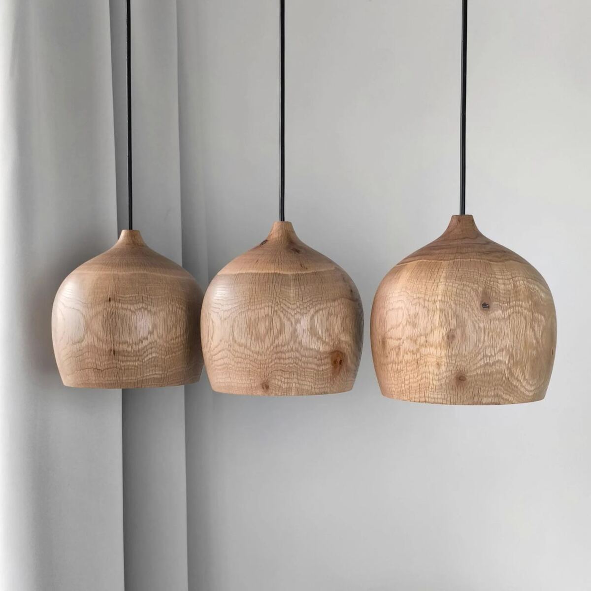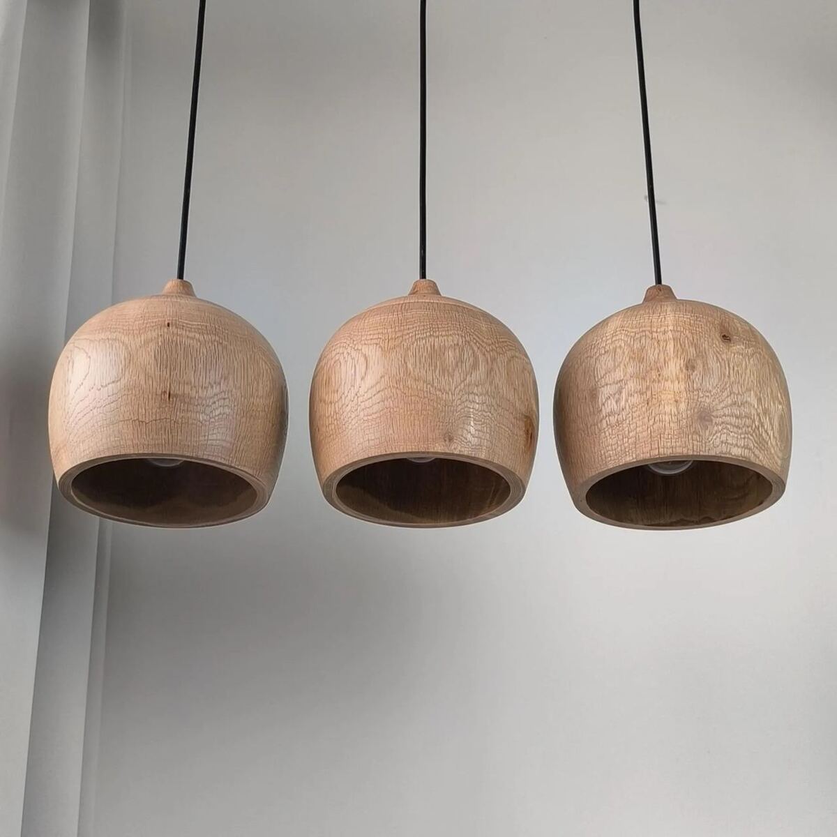 A set of oak pendant lamps. Handcrafted and finished with professional wood oil and wax.