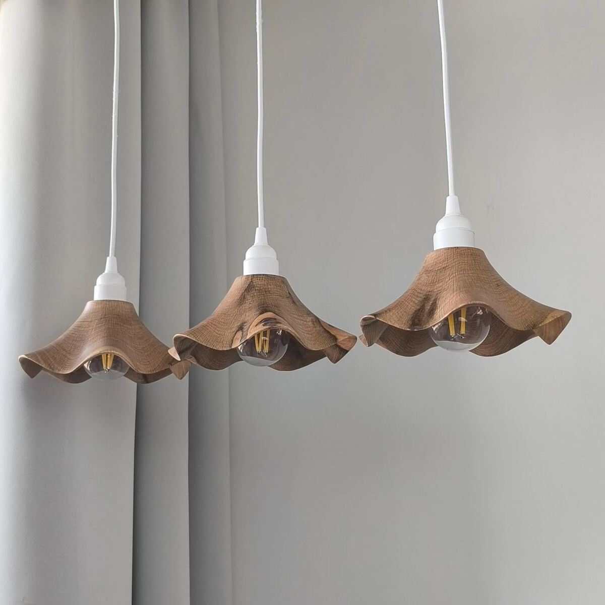 Set of 3 Wooden Flower Pendant Lights, Handcrafted lamps with wavy edges