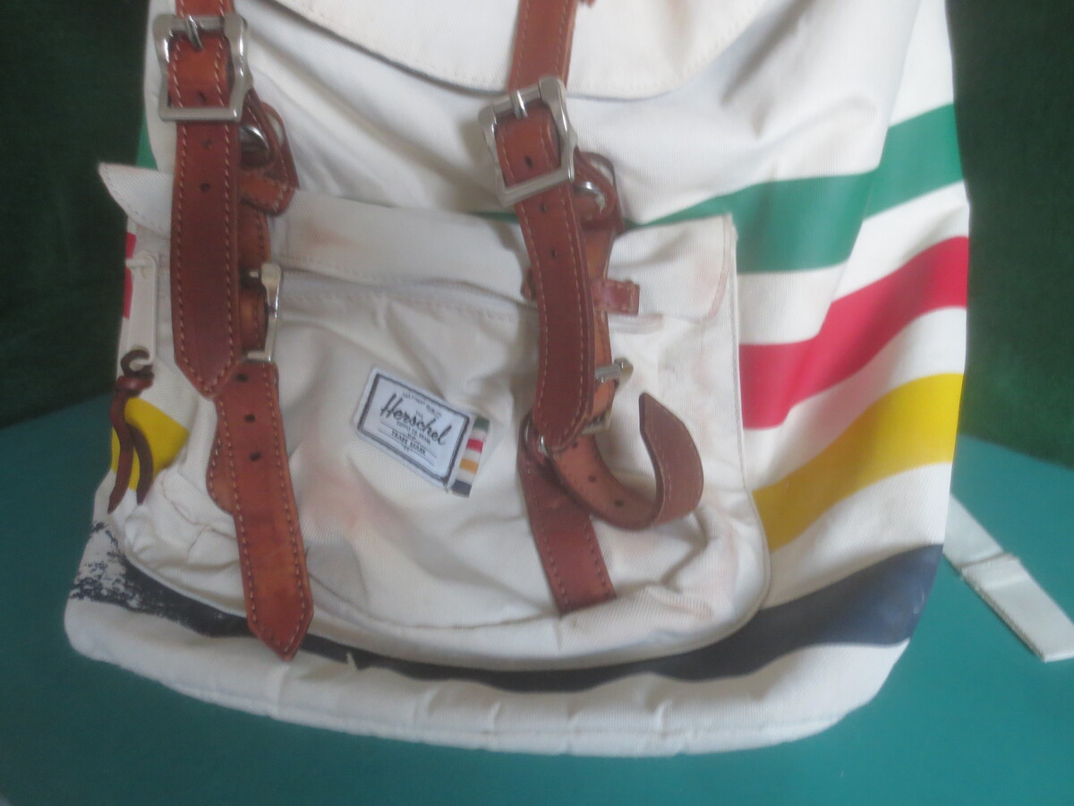 Vintage Herschel Backpack Napsack Exclusively for The Hudson Bay Company of Canada. In very good condition with no damages at all however, there are areas of brown leather drying stain from washing where the leather dyd color had run off during drying. It can be spot cleaned with a color safe bleach one area at a time and then allowing it to dry before moving off to the next area. They are not food, dirt, oil or any other kind of stain at all. This backpack boast a thick rear padding on the straps and the back for ultimate comfort. The interior laptop section is also padded and finished with a black faux fur lining. Nylon weaved moisture repellant exterior. Accented with the famous 4 point Hudsonm Bay stripes. Leather strap magnetic closures. This incredible and fantastic iconic back pack measures approx. 7" deep x 11" wide x 18" height.