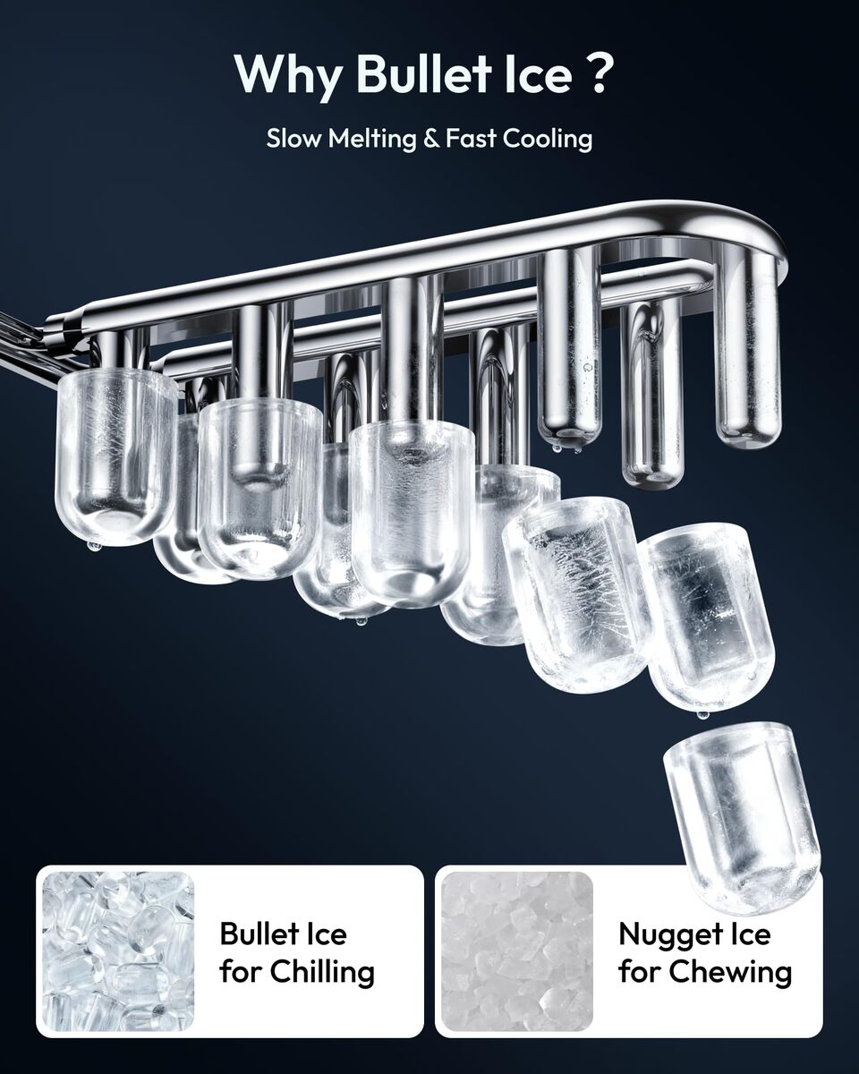 Portable Design Perfect Bullet Ice: Our ice maker comes with a sturdy handle, weighs only 13lbs and with compact size 11.57(L)*11.42(W)*8.74(H)in. Those features make ice maker easy to carry and perform well on any occasions like Kitchen/Home/Camping/RV/Party/Dorm. Also, the newly designed countertop ice maker produce the most popular bullet-shaped smooth ice cubes, which won't stick together easily or hurt your hands or mouth even are perfect for cold drinks, iced coffee or chew as snacks.