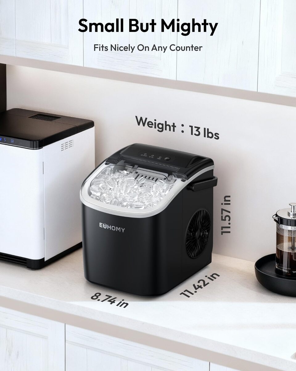6 Mins Ice-Making Ultra Quieter: Our Euhomy ice maker only takes 6mins that will enjoy the first batch of fresh bullet ice. With a 1.2L water tank and powerful compressor, the portable ice maker easily makes maximum ice capacity to 26lbs ice per day and holds up to 1.3lbs ice at a time. Also, our ice maker is not only excellent in refrigeration, but also at less than 45db normal noise, ensuring a comfortable and quiet environment to enjoy ice-making, similar to a working freezer.