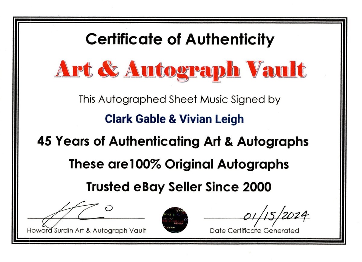 Double matted autographed Sheet Music is signed with the original signature of following: Clark Gable Vivian Leigh