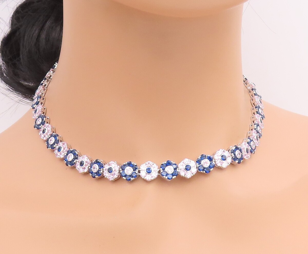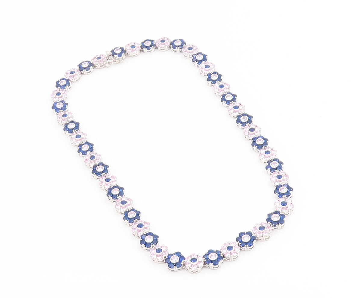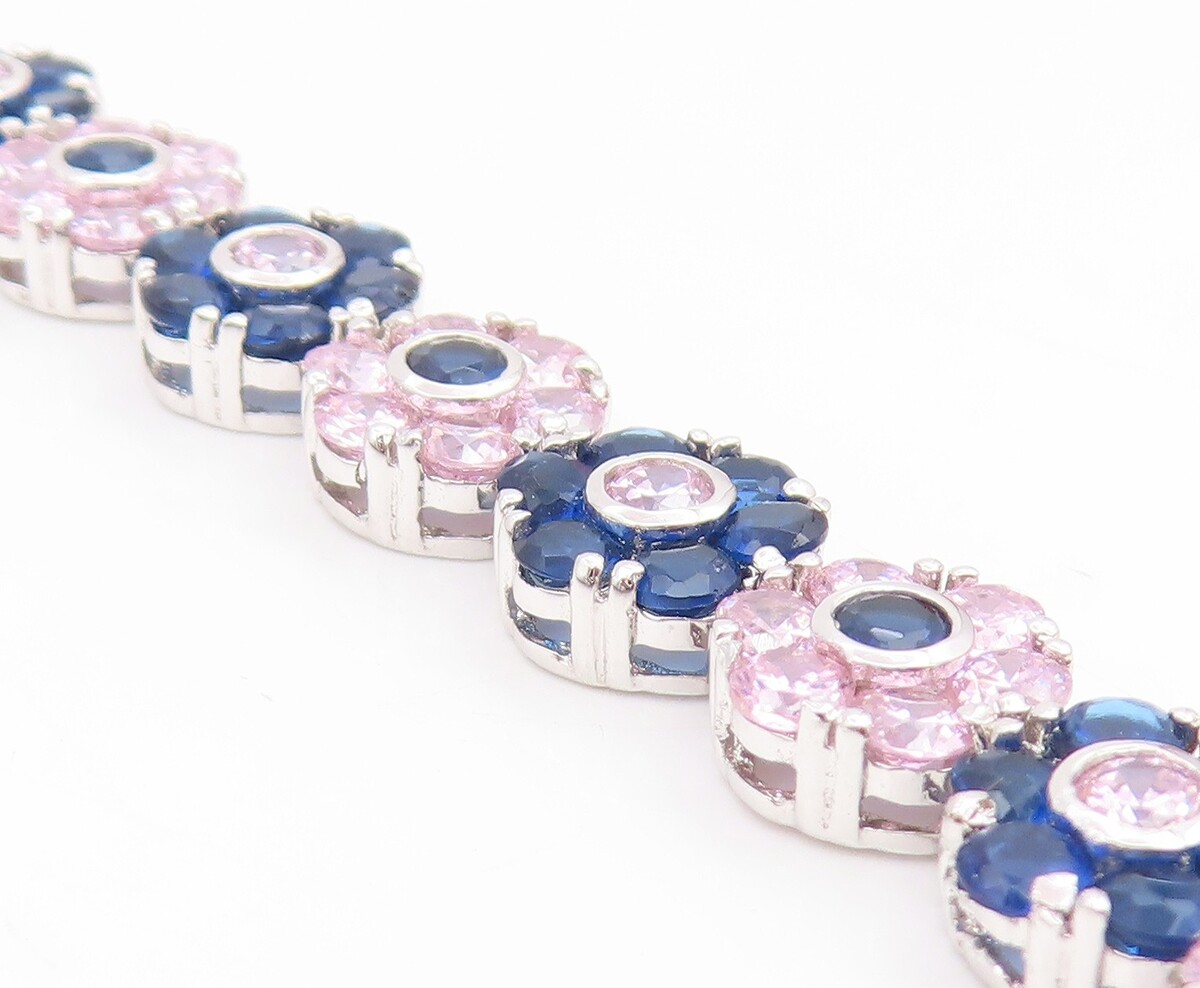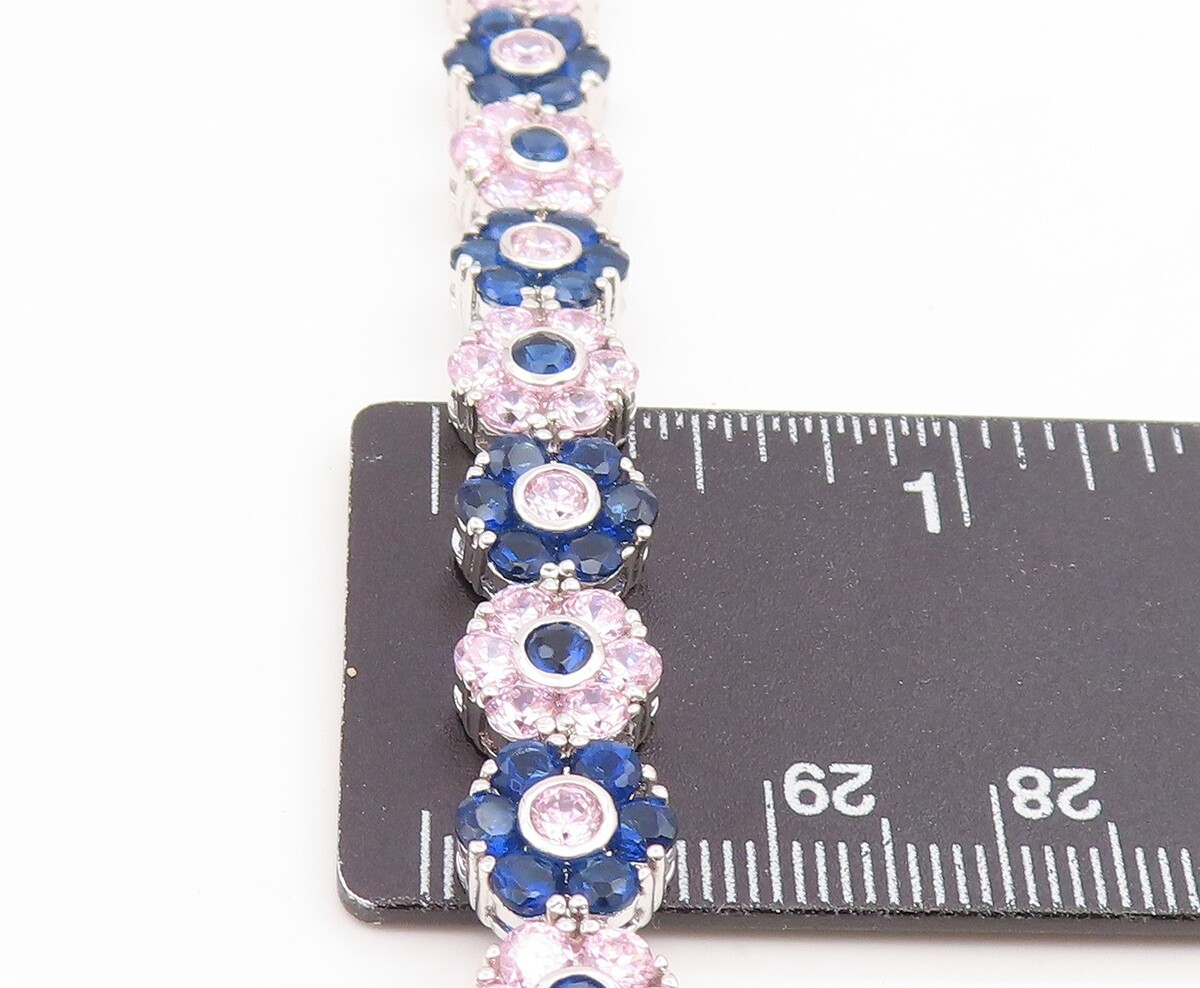 925 Sterling Silver Vintage Necklace Pink & Blue Topaz Floral Link Chain NE4813