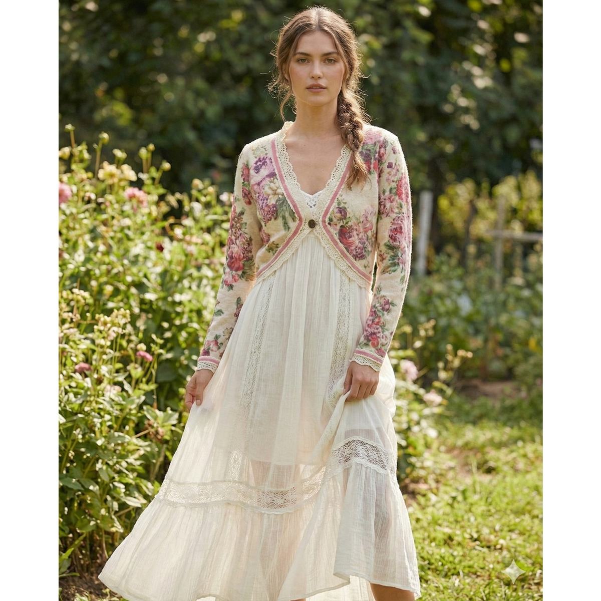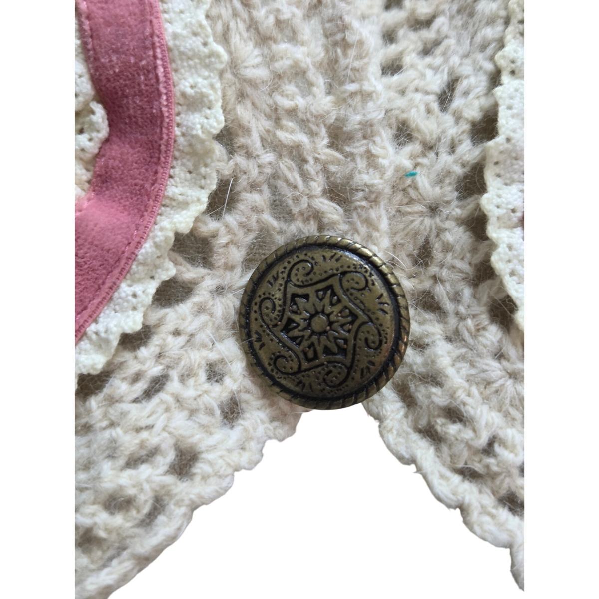 What you?ll love about this vintage Marisa Christina bolero sweater is the ultra-romantic cropped silhouette paired with delicate floral knit, lace edging, and subtle beaded accents?pure coquette charm with a soft, heirloom feel that layers beautifully over dresses and camisoles.