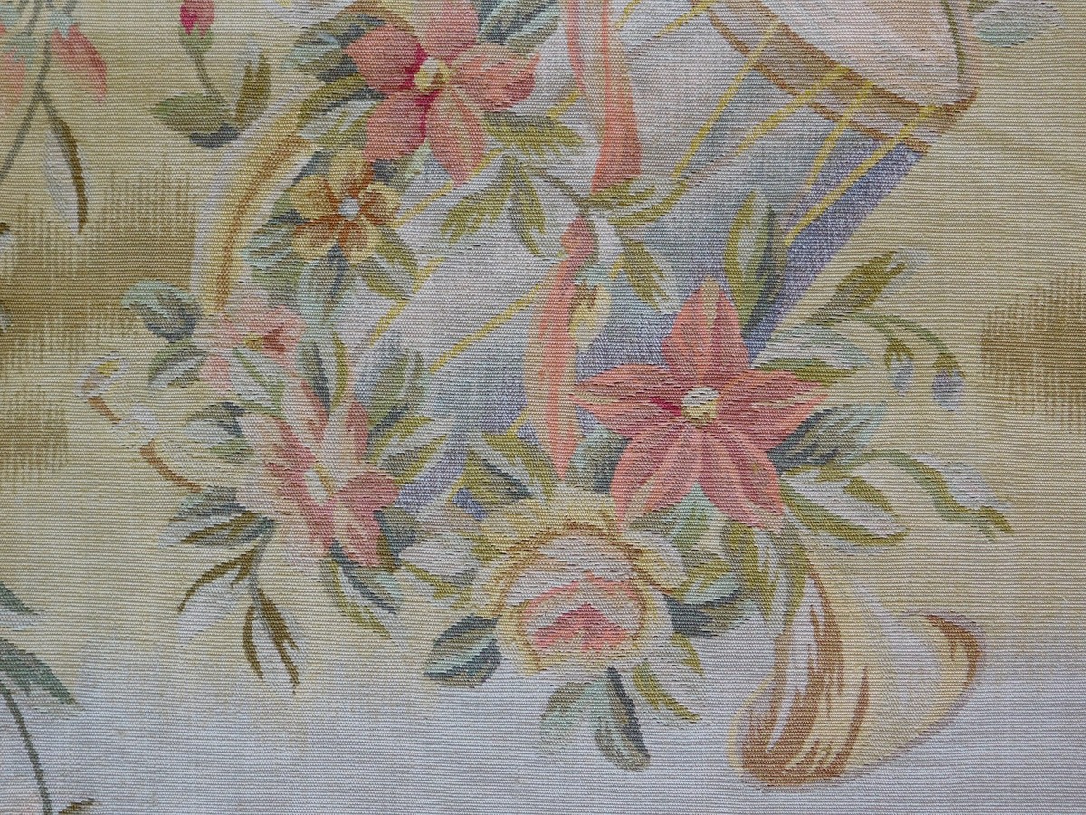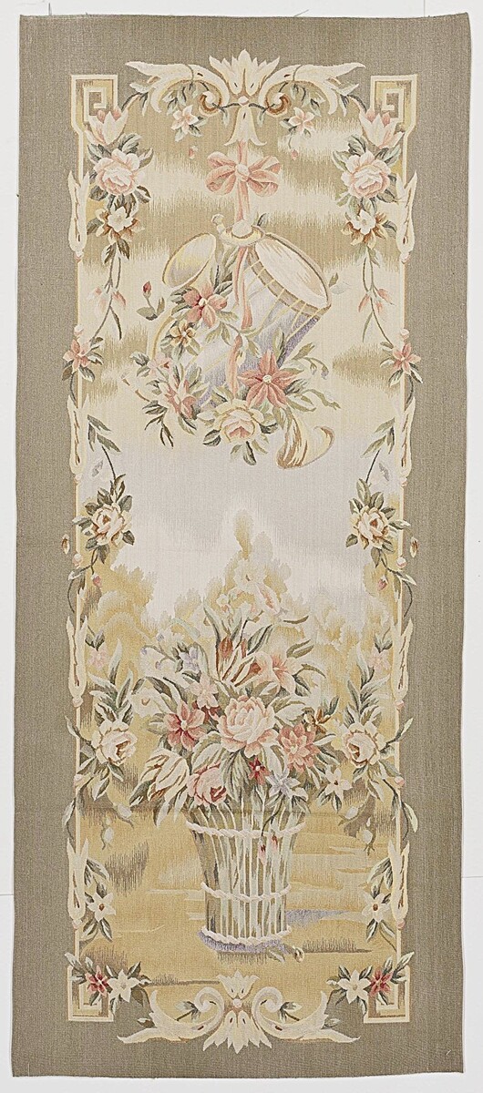 This handwoven Abusson-style tapestry is a beautiful and luxurious addition to any room. Made with 100% silk and featuring a floral pattern in green, this French-inspired piece is handwoven with a low pile height and measures 2'6'' x 5'0''. The intricate design and high-quality craftsmanship make it a unique and stylish focal point for any space. Professional cleaning is recommended to maintain its pristine condition, and its original construction ensures a one-of-a-kind piece for your home.