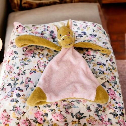 Lovely and cuddy Maison Chic pink lovey security blanket with brown plush horse is simply too cute! There are hook and loop fasteners on his "arms" so that you can attach it to a stroller or baby seat. Very soft and sweet.