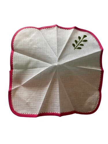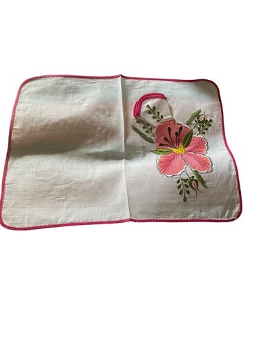 Add a touch of vintage charm to your dining table with this lovely set of appliqued embroidered pink hibiscus flower fabric placemats and napkins. The set includes four cocktail napkins and four placemats, all of which are made from high-quality sheer weave fabric that is easy to clean and maintain. The intricate embroidery of the hibiscus flower adds a touch of elegance to the table setting, making it perfect for all occasions. The cocktail size napkin tucks into the pocket on the flower- so adorable!