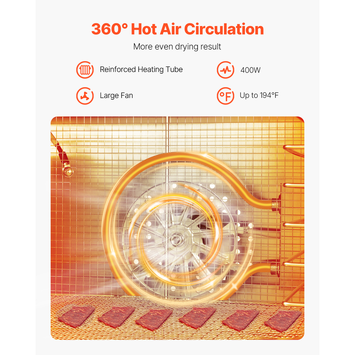 Efficient Even Drying: With an upgraded thickened heating tube and large fan, the heating tube generates heat while the fan circulates the warm air inside, evenly penetrating the food. The food dehydrator machine ensures even drying while preserving nutrients without loss