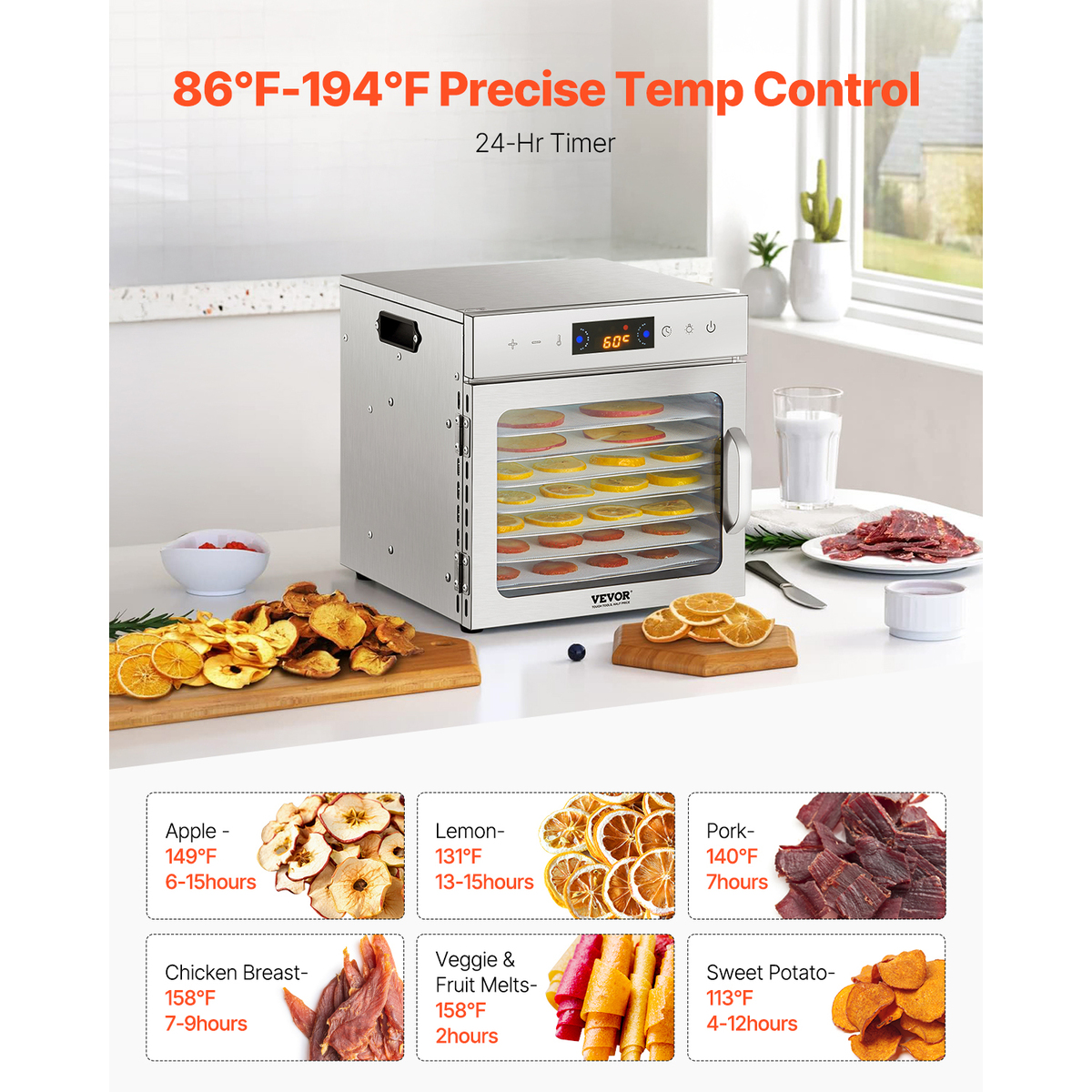 8-Layer Large Capacity: This large dehydrator can hold up to eight layers of food at once, drying large amounts of ingredients in one go. Control with a smart digital display, adjustable from 86? to 194? / 30? to 90?, and a 24-hour intelligent timer means no need for manual supervision. Perfect for dehydrating various fruits, vegetables, jerky, herbs, teas, and seafood