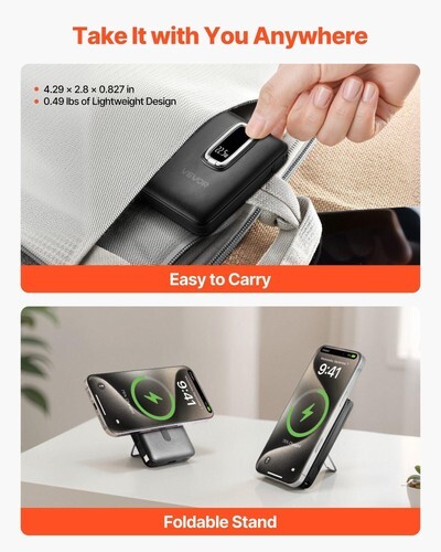 This 0.49 lb magnetic portable charger power bank is small enough for any pocket or purse. With a handy foldable stand, you can charge while watching videos on the go.