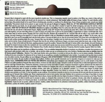 FOR SALE IS ONE (1) NEW TEMPARIN MAX ADVANCED DENTAL KIT WITH LONG LASTING TEMPORARY DENTAL REPAIR CEMENT MANUFACTURED BY DenTek ORAL CARE INCORPORATED MPN 00123 UPC# 047701001233. SOLD FACTORY SEALED AND FACTORY FRESH, MANUFACTURED IN ITALY, WITH 2.5 TIMES MORE REPAIRS (13 repairs), 2.64 grams = 13+ REPAIRS IN THIS VALUE SIZE CONTAINER OF TEMPARIN MAX DENTAL REPAIR CEMENT WITH 2.5X MORE, WHICH MAY BE RECAPPED FOR FUTURE USE, THE ALWAYS FACTORY SEALED AND ALWAYS FACTORY FRESH MANUFACTURERS EXPIRATION DATE IS ALWAYS ON THE TOP OF THE FACTORY SEALED PACKAGING ON THE CAP, AND OFTEN ALLOWS 12+ months OF USE BEFORE THE INDICATED EXPIRATION DATE, SINCE ALL OF MY PRODUCT IS FACTORY FRESH ALWAYS. THIS DENTEK BRAND TEMPARIN MAX DENTAL REPAIR CEMENT CONTAINER DELIVERS 13+ DENTAL REPAIRS TO LOST FILLING(s), LOOSE CROWN(s) OR LOOSE CAP(s). TEMPARIN MAX TEMPORARY DENTAL CEMENT IS DESIGNED TO REPAIR WITH THE SAME INGREDIENTS DENTISTS USE. THIS TEMPORARY REMEDY IS MEANT TO REPLACE A LOST FILLING, LOOSE OR LOST CROWN, CAP OR INLAY UNTIL YOU HAVE A CHANCE TO VISIT YOUR DENTIST. TEMPARIN MAX REPAIR CEMENT BY DenTek SHOULD ONLY BE REMOVED BY A DENTAL PROFESSIONAL. TEMPARIN MAX DENTAL REPAIR CEMENT BY DenTek IS MADE IN ITALY FOR DenTek ORAL CARE INCORPORATED OF MARYVILLE, TENNESSEE, USA. YOU WILL RECEIVE ONE (1) PACKAGE OF TEMPARIN MAX LONG LASTING TEMPORARY REPAIR BY DenTek BRAND SHIPPED BY USPS.....