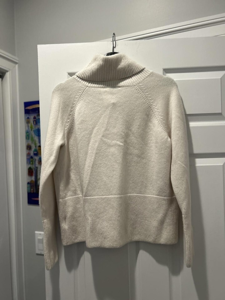 Cream-colored turtleneck sweater made from a blend of 80% merino extra fine wool and 20% cashmere. Soft, warm, and comfortable with ribbed cuffs and hem. Size Small. Designed in San Francisco, made in China. Perfect for casual or office wear in colder weather.