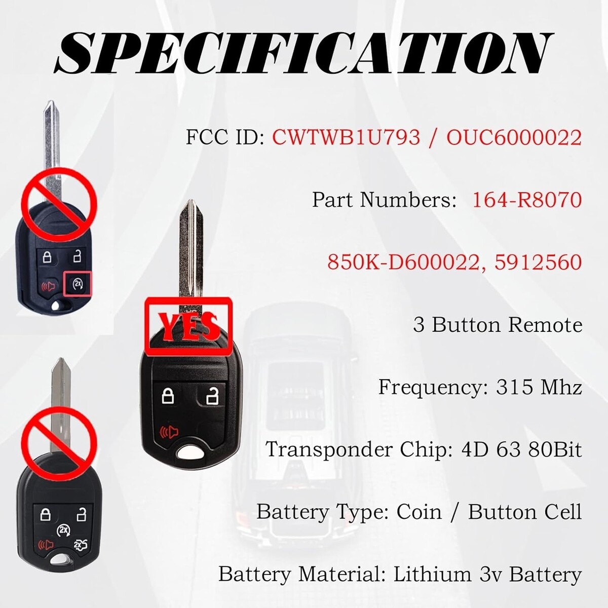 REPLACEMENT: This Keyless Entry Remote Control Car Key Fob Replacement Is Compatible with Part Numbers: 164-R8070, 850K-D600022, 5912560 Compatible with Mercury Monterey 2005-2007 Mariner 2005-2006