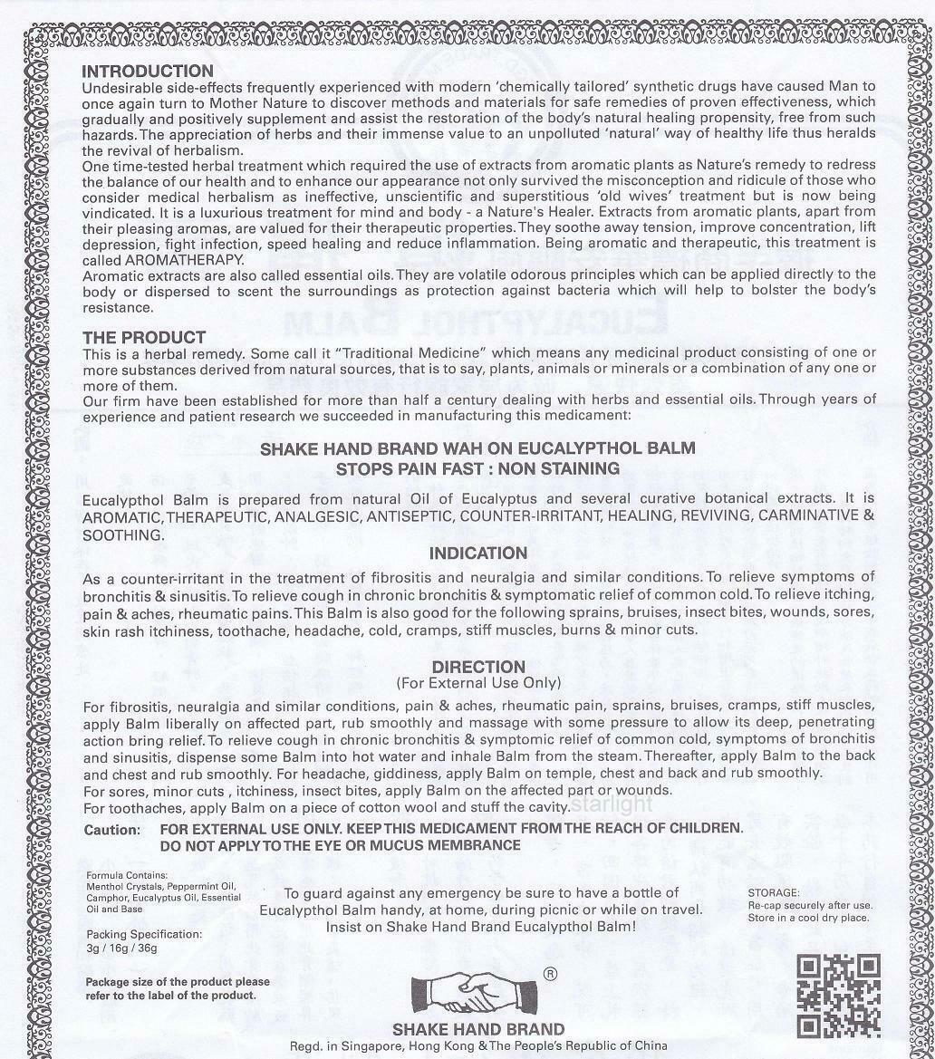 A cold rub, Shake Hand Brand Wah On Eucalypthol Balm is prepared with natural eucalyptus oil and several healing botanical extracts.