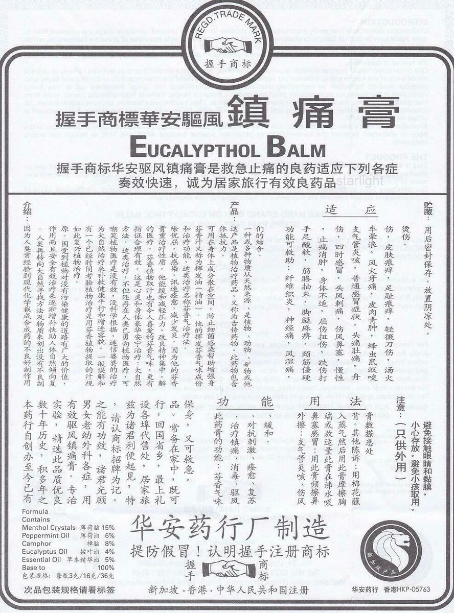 握手 商标 华安 驱 风 镇痛 膏 Wah On Eucalypthol Balm |