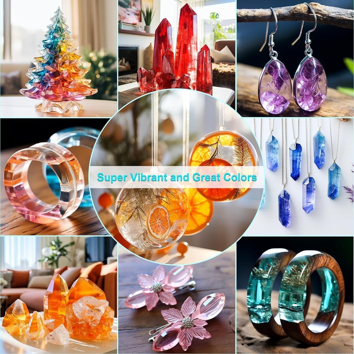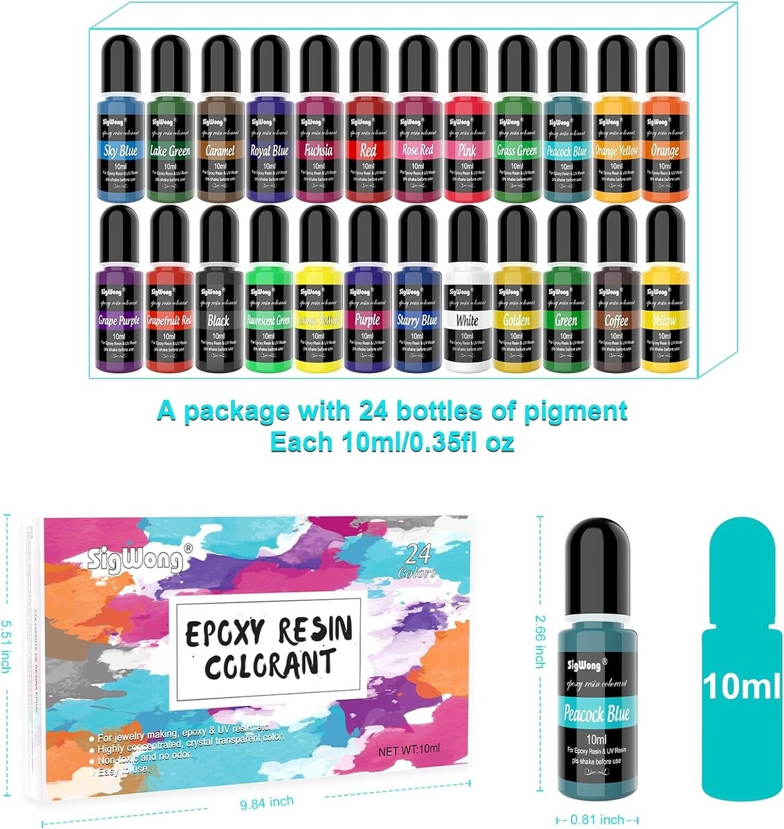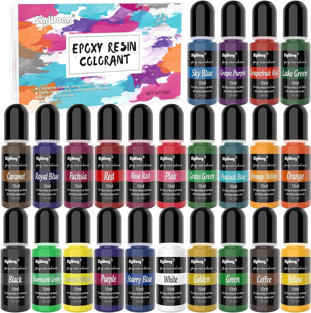 STUNNING COLORS - Total 24 beautiful colors liquid epoxy resin pigment: yellow, lemon yellow, golden, orange, red, orange yellow, pink, rose red, purple, fuchsia, fluorescent green, peacock blue, grass green, green, sky blue, royal blue, caramel, lake green, coffee, white, black, grapefruit red, starry blue, grape purple. Each resin colorant 10ml/