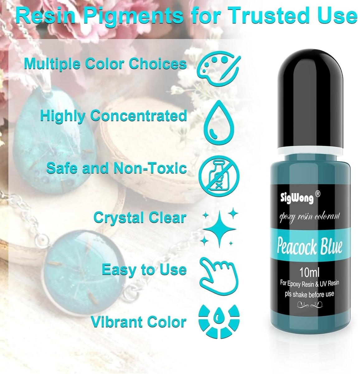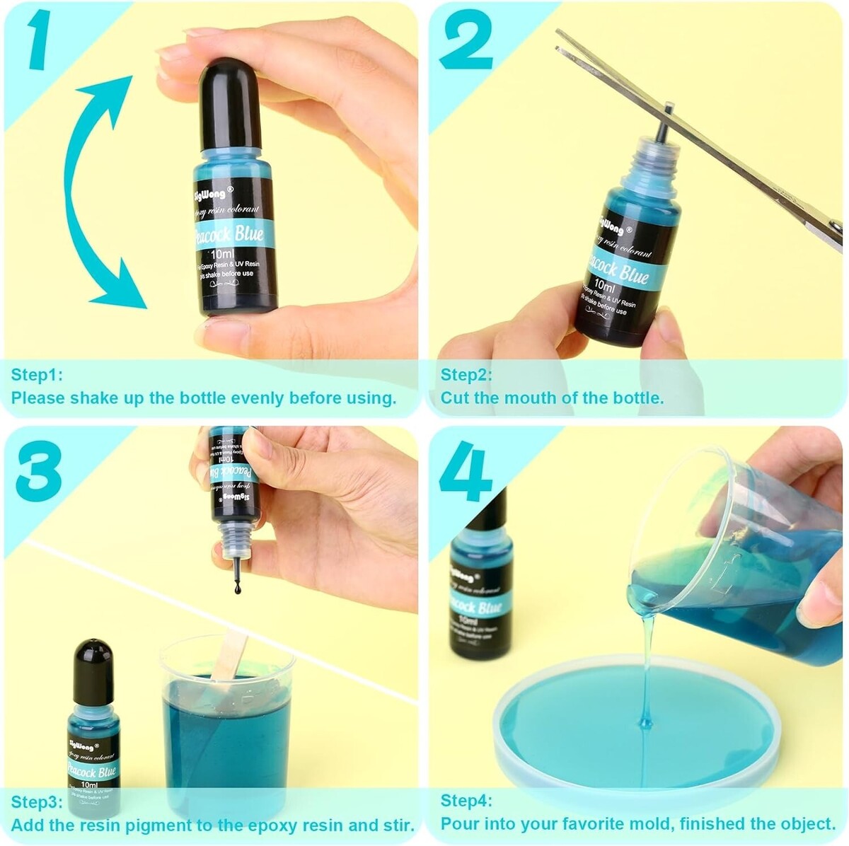CONCENTRATED TRANSPARENT LIQUID DYE - The UV resin dye can mix well into resin, and these epoxy resin color pigments are very concentrated, just a little drop can go a long way! It also can mix with another epoxy colorant to achieve the desired color or mix the white color to achieve opacity.