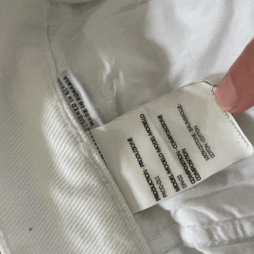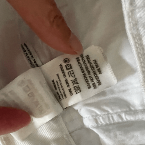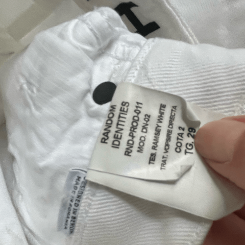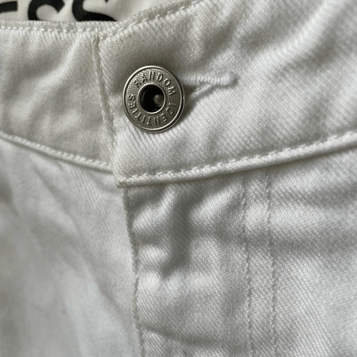 Random identities I bless the 60s white . ?Straight-leg non-stretch denim jeans in white. High-rise, 12.5?. Five-pocket styling. White leather logo patch, belt loops, and O-ring hardware at waistband. Zip-fly. Logo engraved black and silver-tone hardware. Supplier color: White 100% cotton. Brand: Random Identities. Lane flat measures 14.5 inches straight across the waist and a 28? inseam. $225 retail.