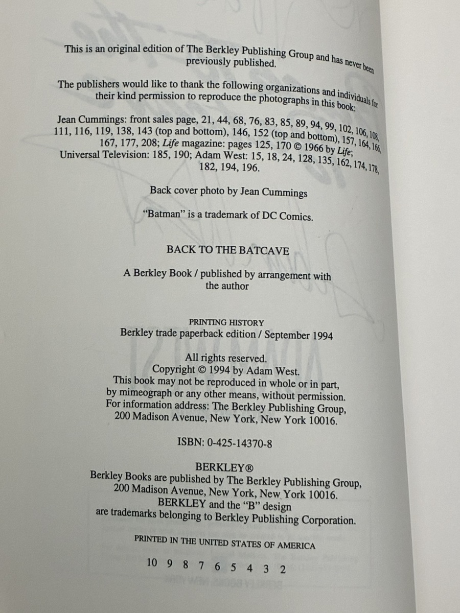 Back to the Batcave signed 1st Edition Adam West Batman memoir biography 1994