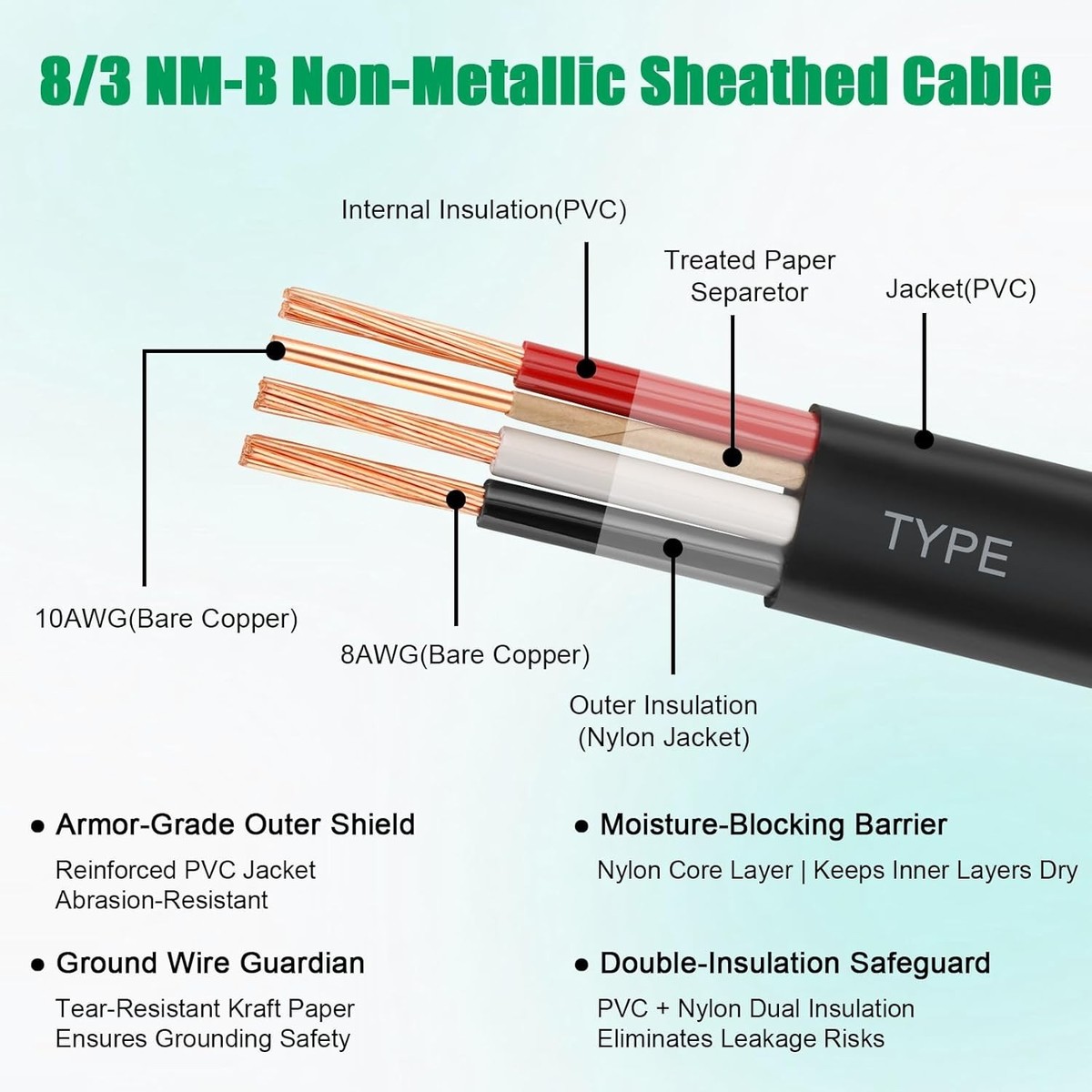[Pure Copper Conductors NEC-Compliant Build]: Features highly conductive pure copper inner conductors for efficient current flow. Configuration includes 4 conductors (3x 8AWG current-carrying wires + 1x 10AWG ground wire). The ground wire is wrapped in kraft paper per standard practice for secure grounding.