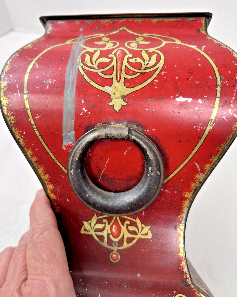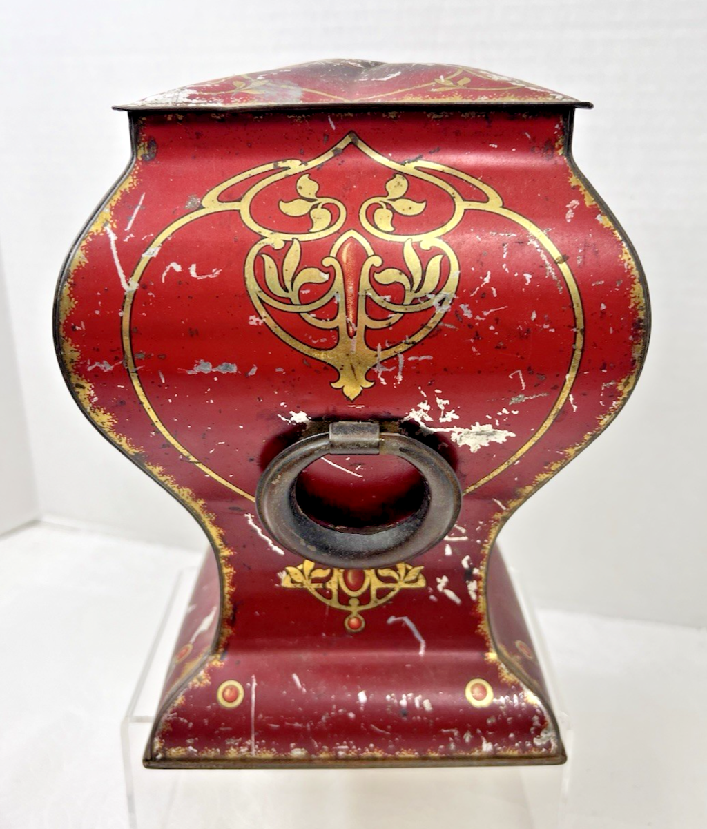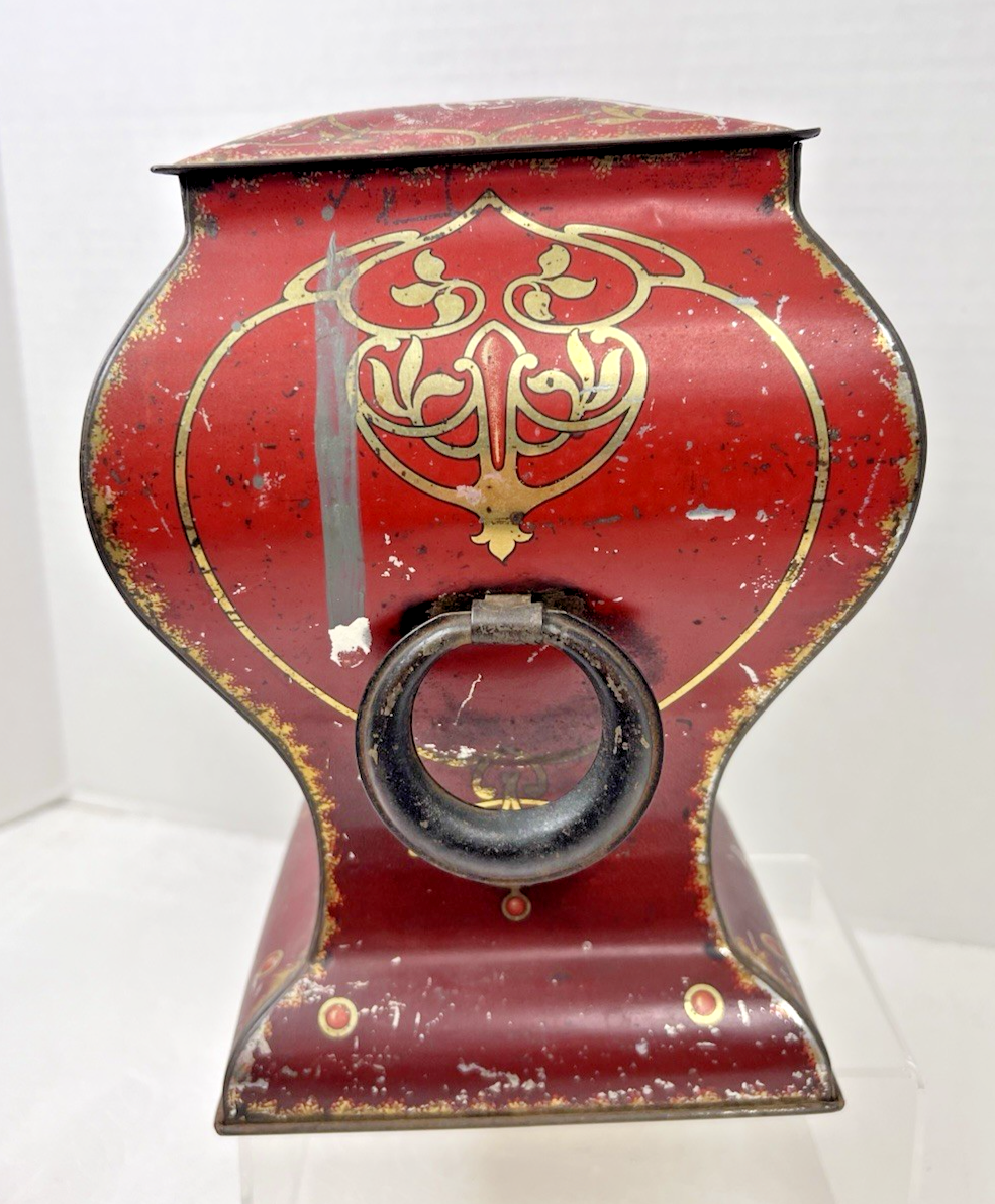 Antique Tin Litho Beautiful Woman Tall w Handles Very Much As Found Still Lovely about 8 3/8 inches tall base is 5.5 square sold as found and seen in our photos it is dented but still well fun.
