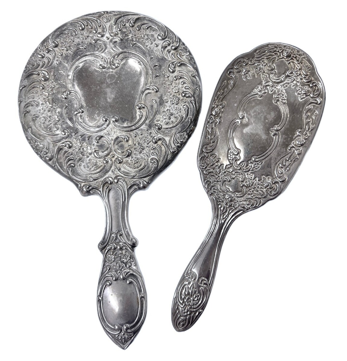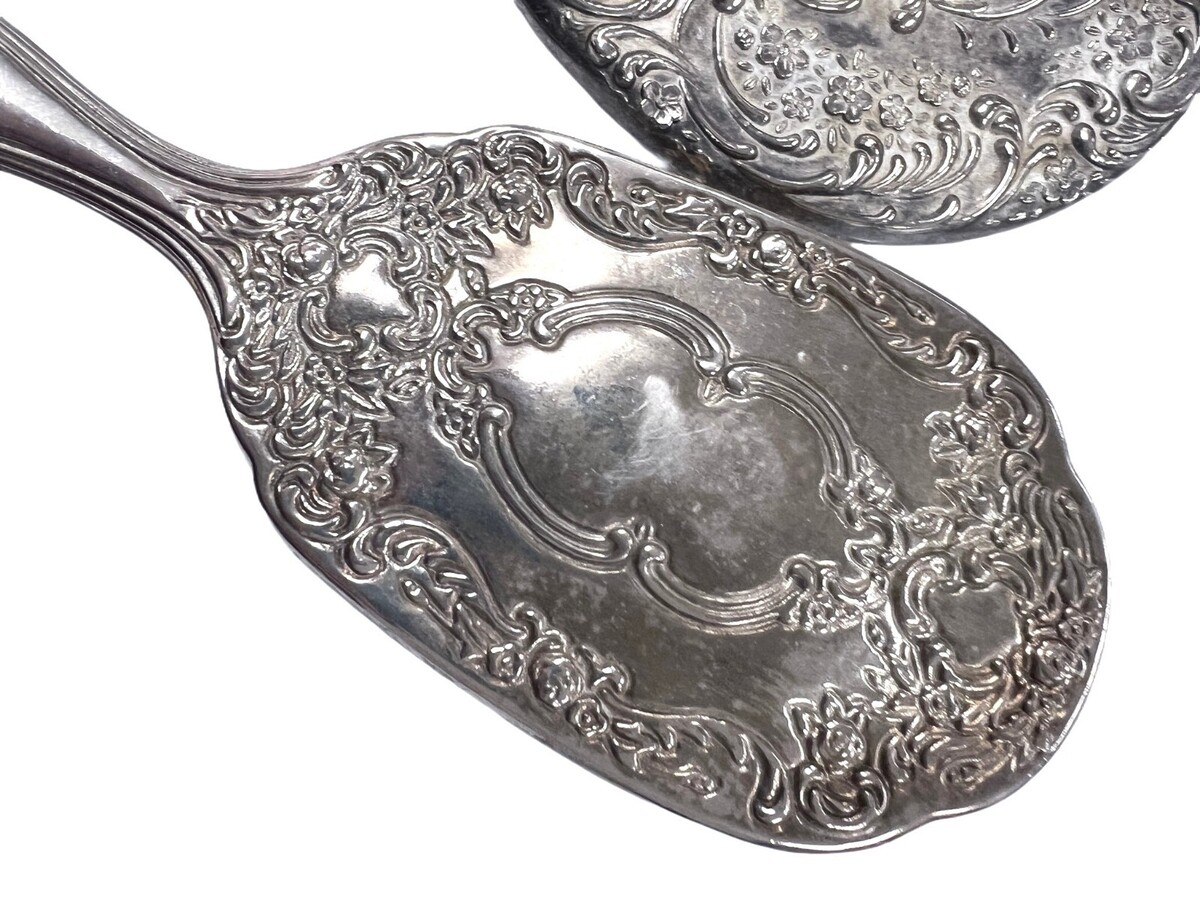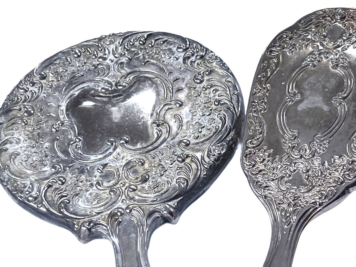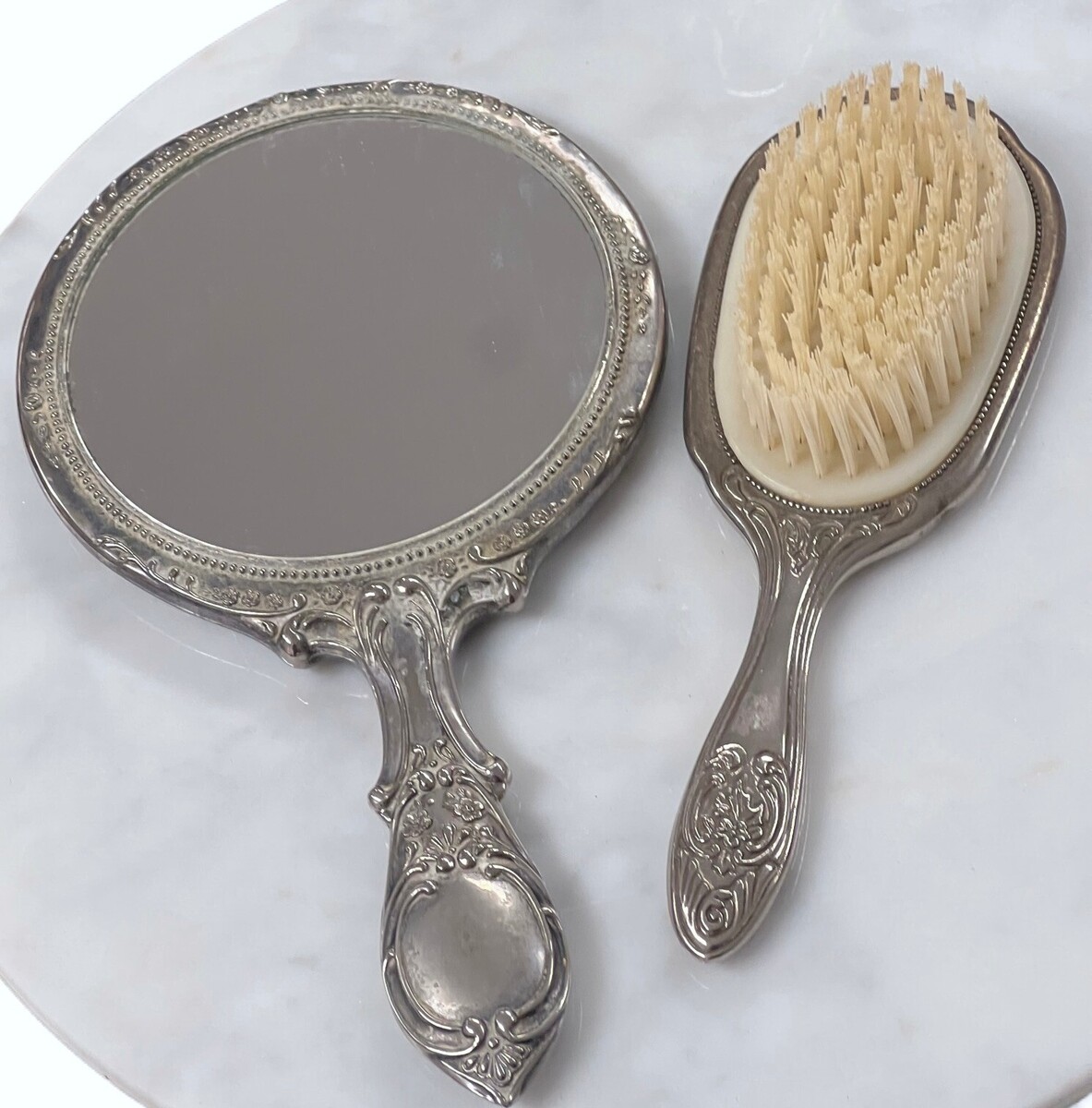 VTG International Silver Plated Antique look Mirror, Brush Heavy Ornate