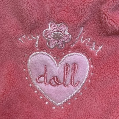 My first doll embroidered on a coral pink blanket