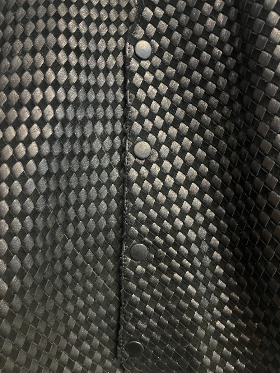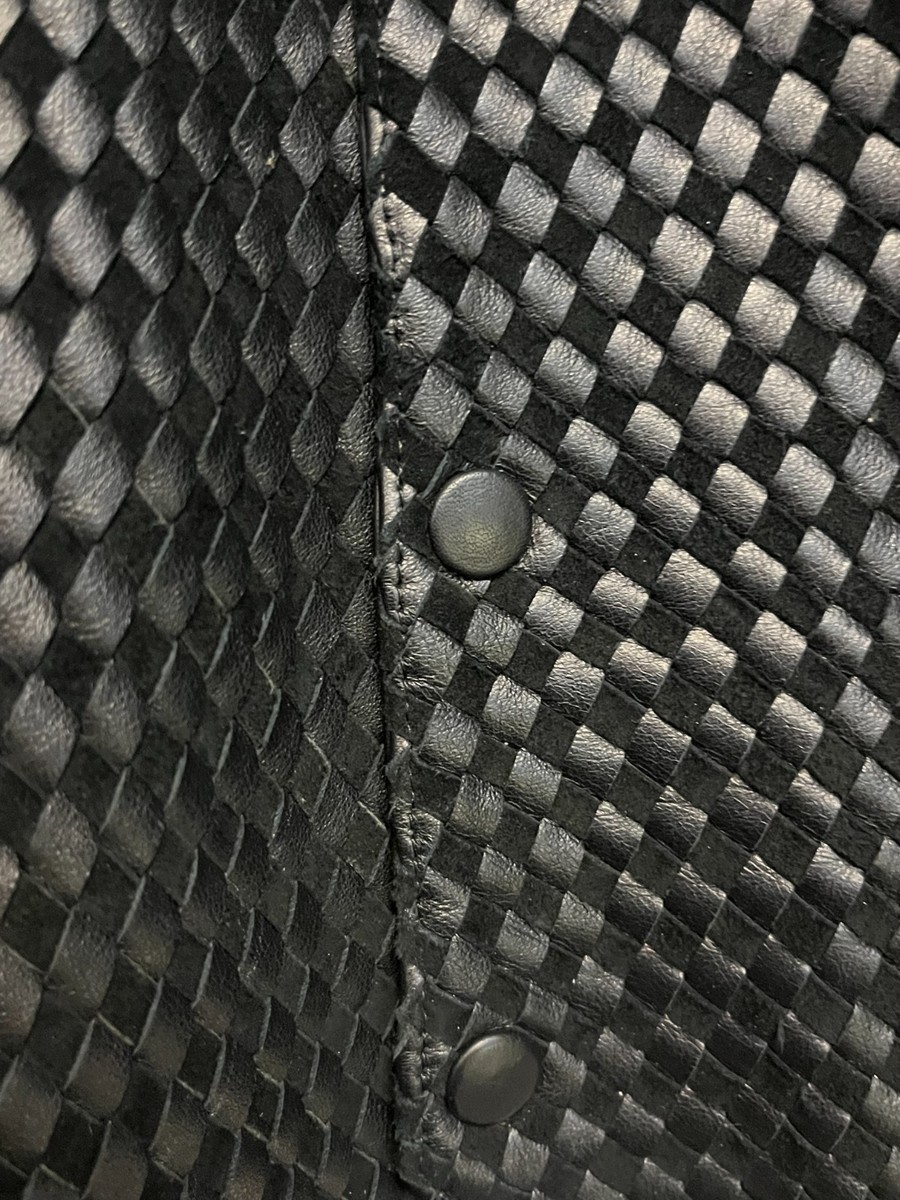 Features: Textured woven leather front, snap closure, V?neck, solid leather shoulders