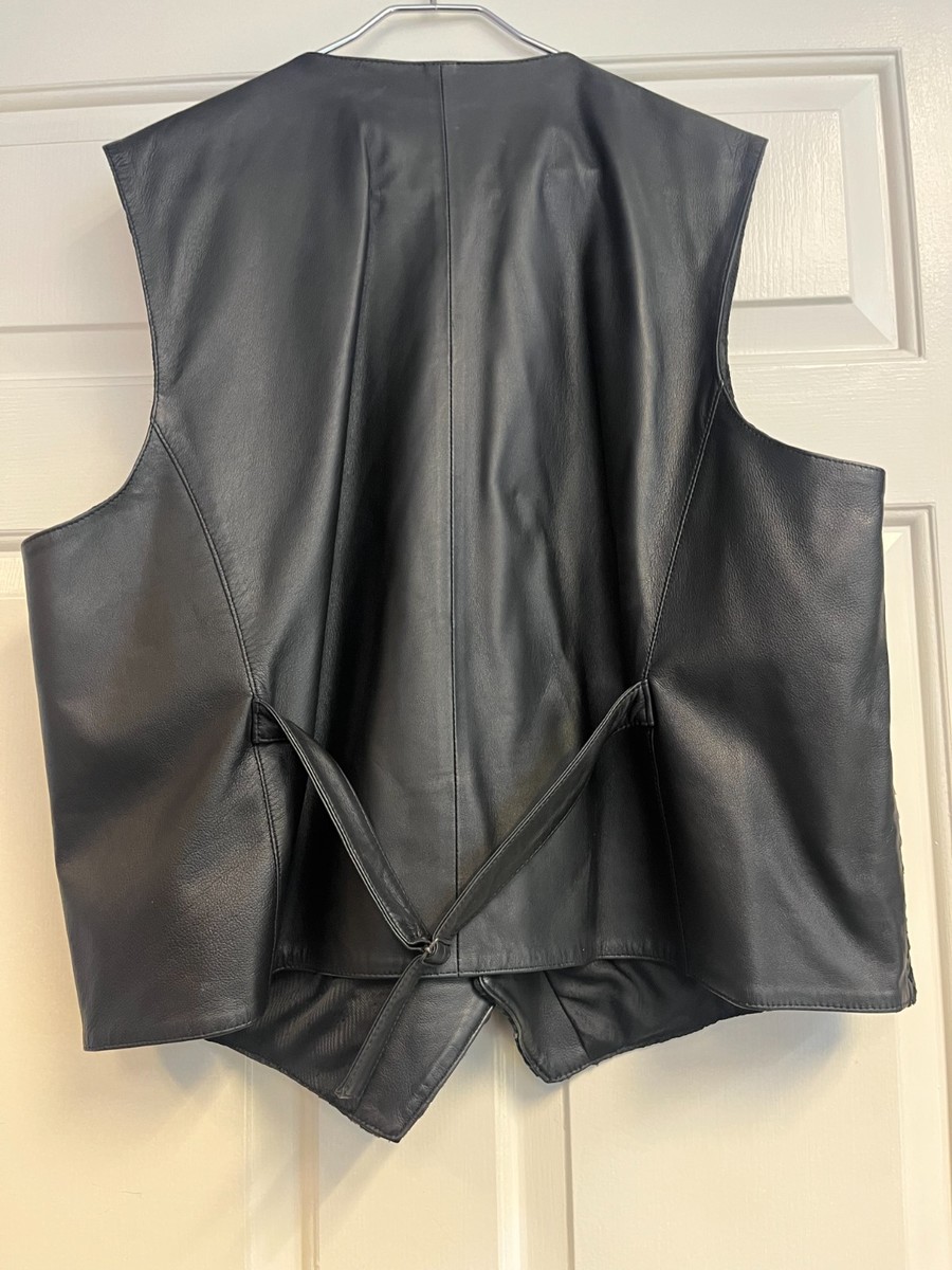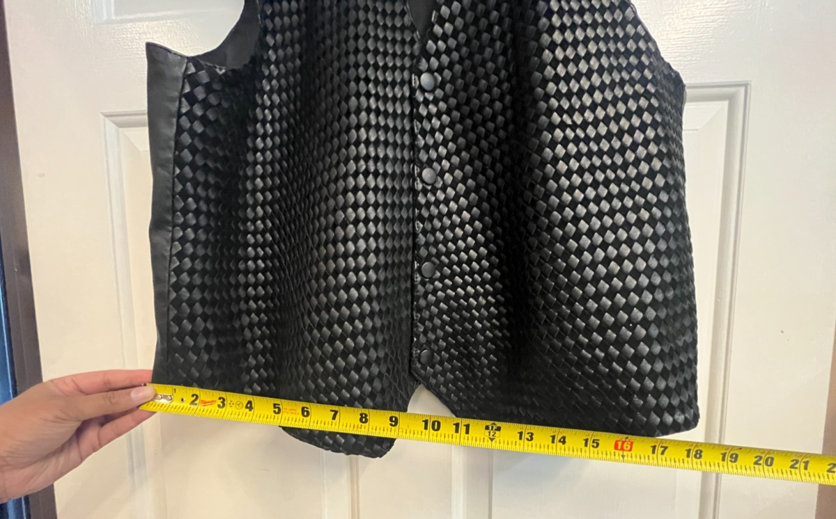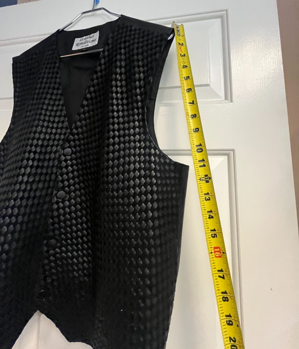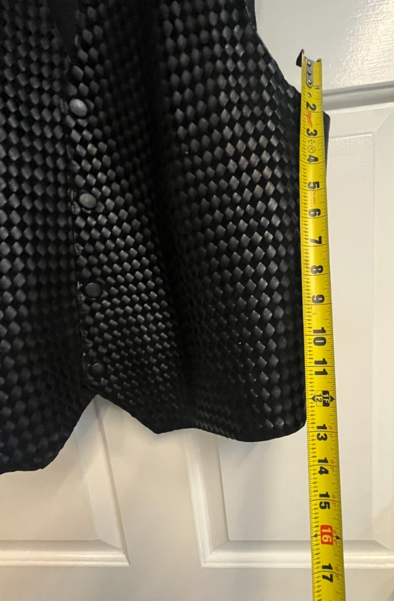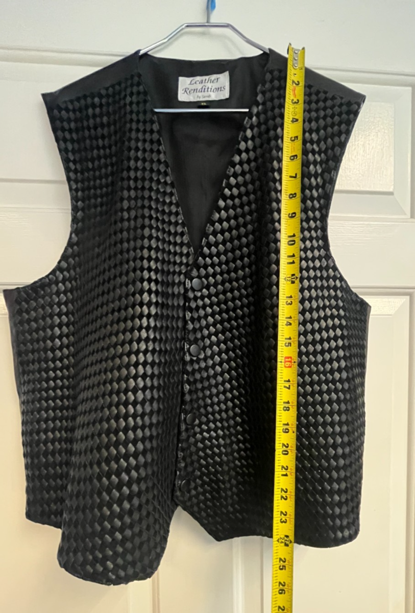 Men?s Leather Renditions by Sandi woven black leather vest in size XL with the same basketweave pattern as your brown version. The vest features a striking textured leather front, solid leather at the shoulders, snap?front closure, and a full lining for comfort. Great statement piece for Western events, nights out, or layering over a dress shirt or tee. Pre?owned in very good condition with only light signs of wear; see photos for exact condition and texture deta