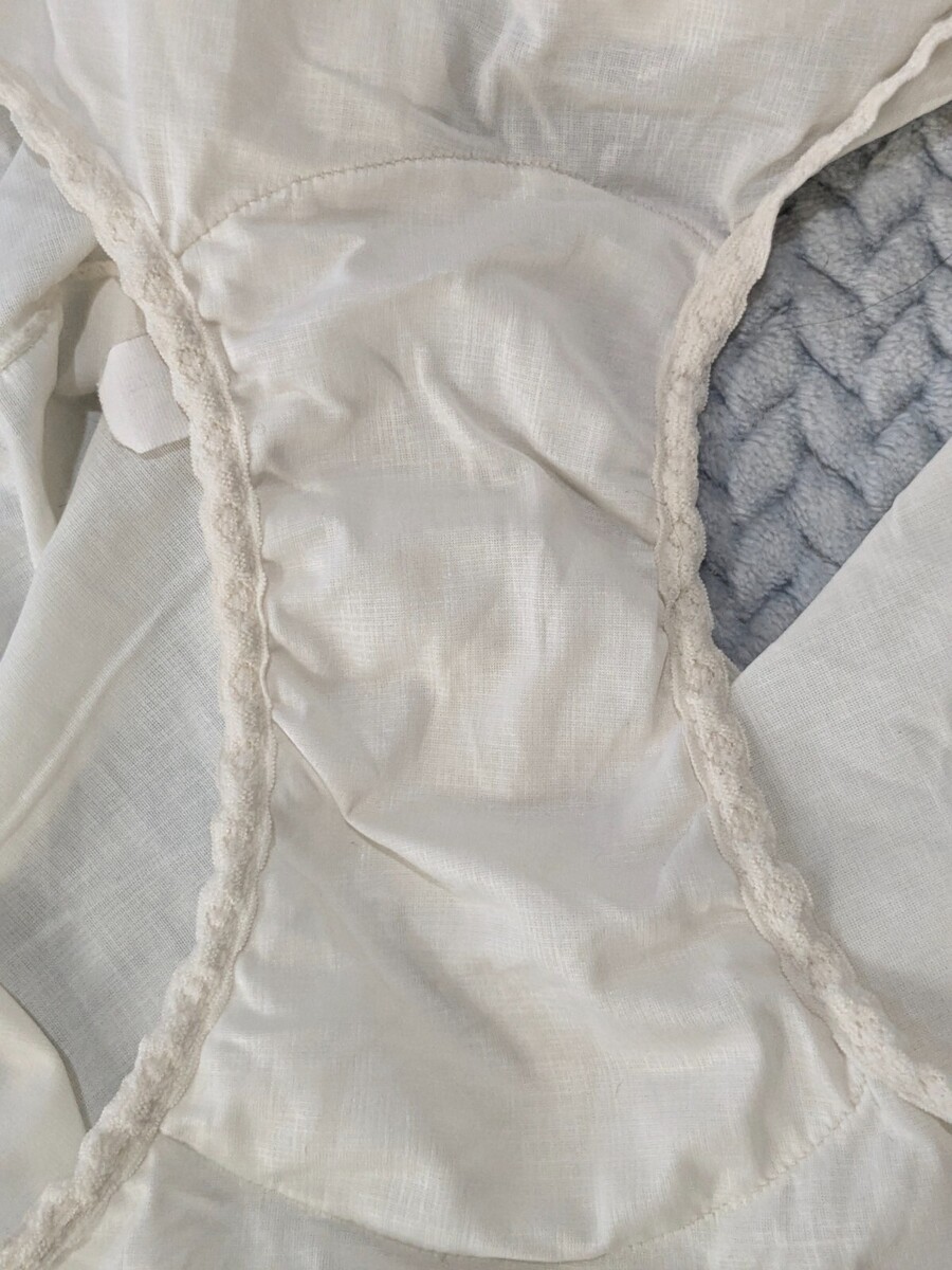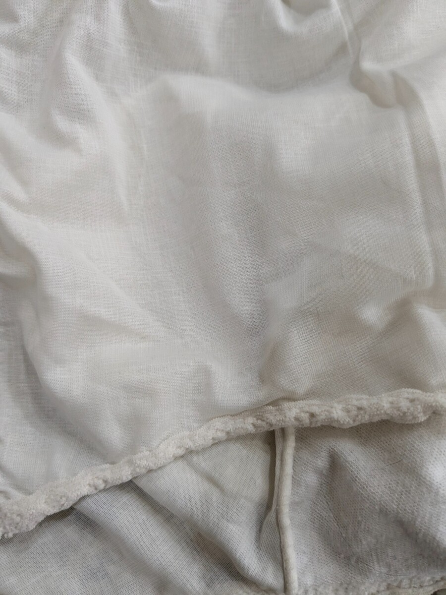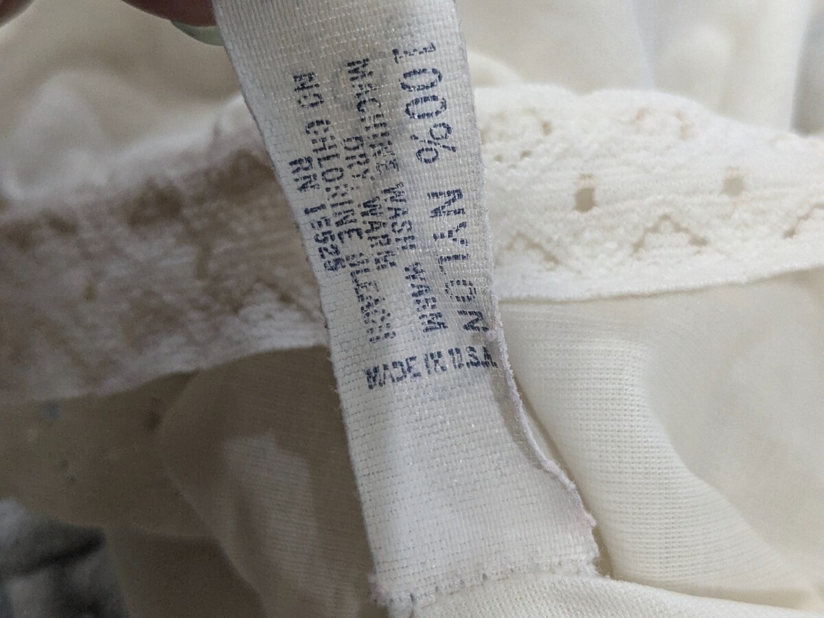 Cream/off white. Some wear from age as shown and could use a bit of ironing to straighten out lace and edges if desired. 100% nylon but feels almost like cotton. See pics.
