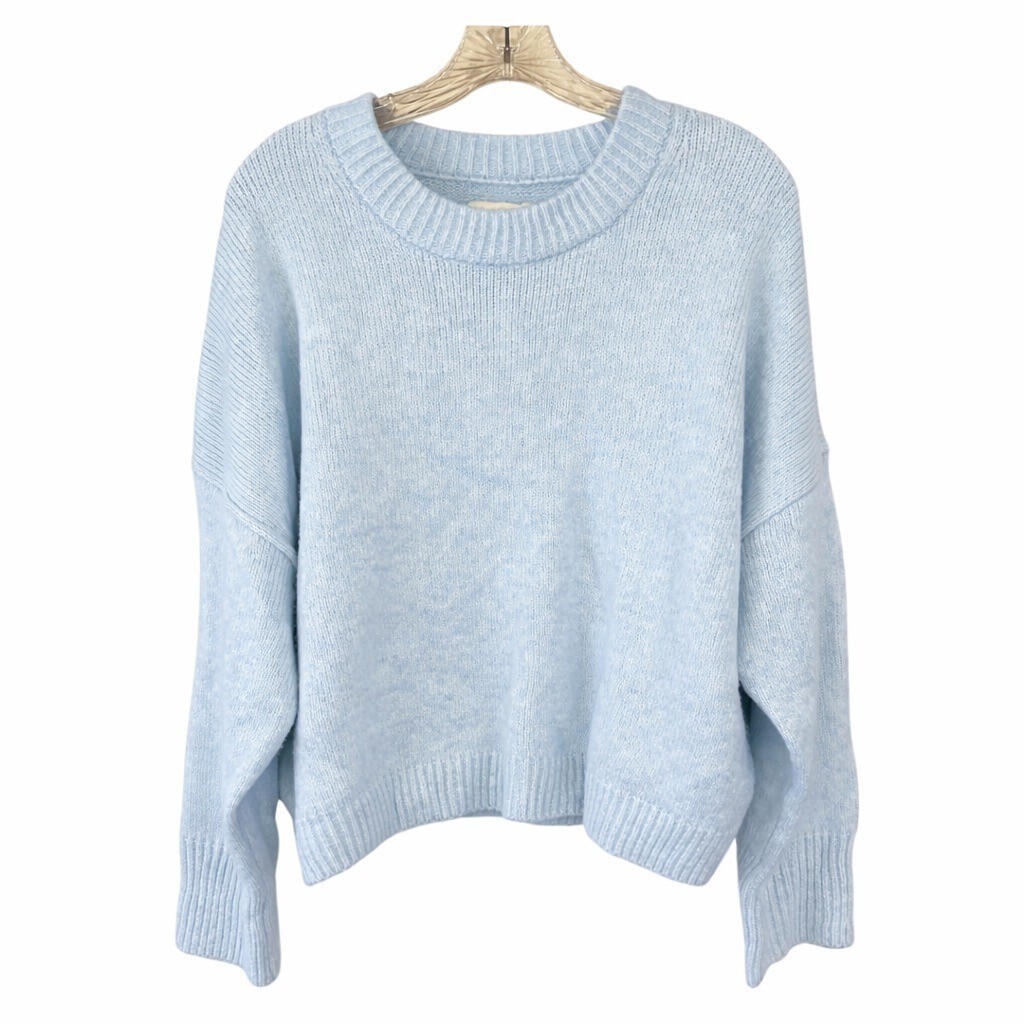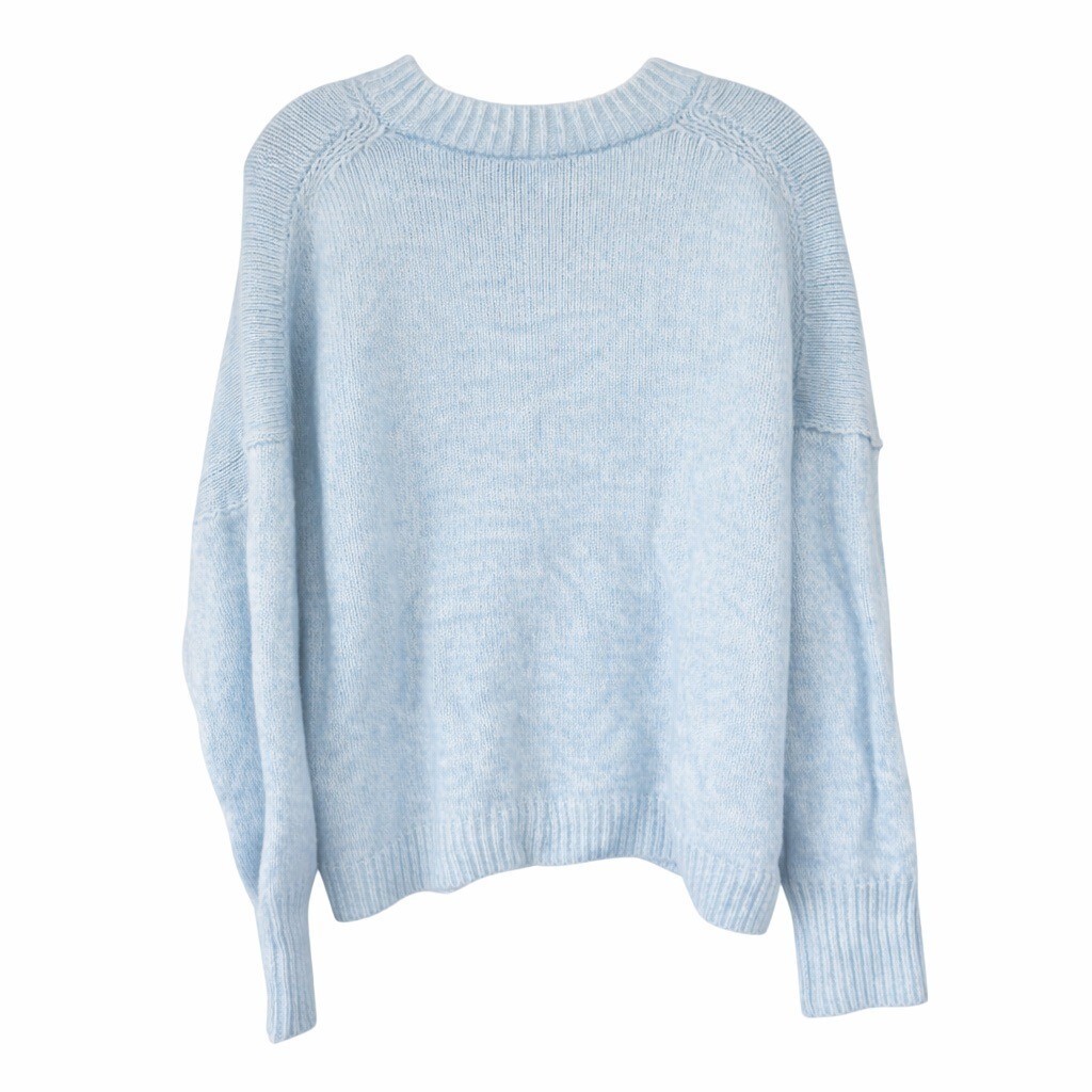 Soft knit sweater by Abercrombie Fitch in a pale light blue tone. Features a classic crewneck with ribbed collar, cuffs, and hem, and an easy oversized fit. Versatile layering piece that works for casual wear, cozy loungewear, or relaxed everyday styling.