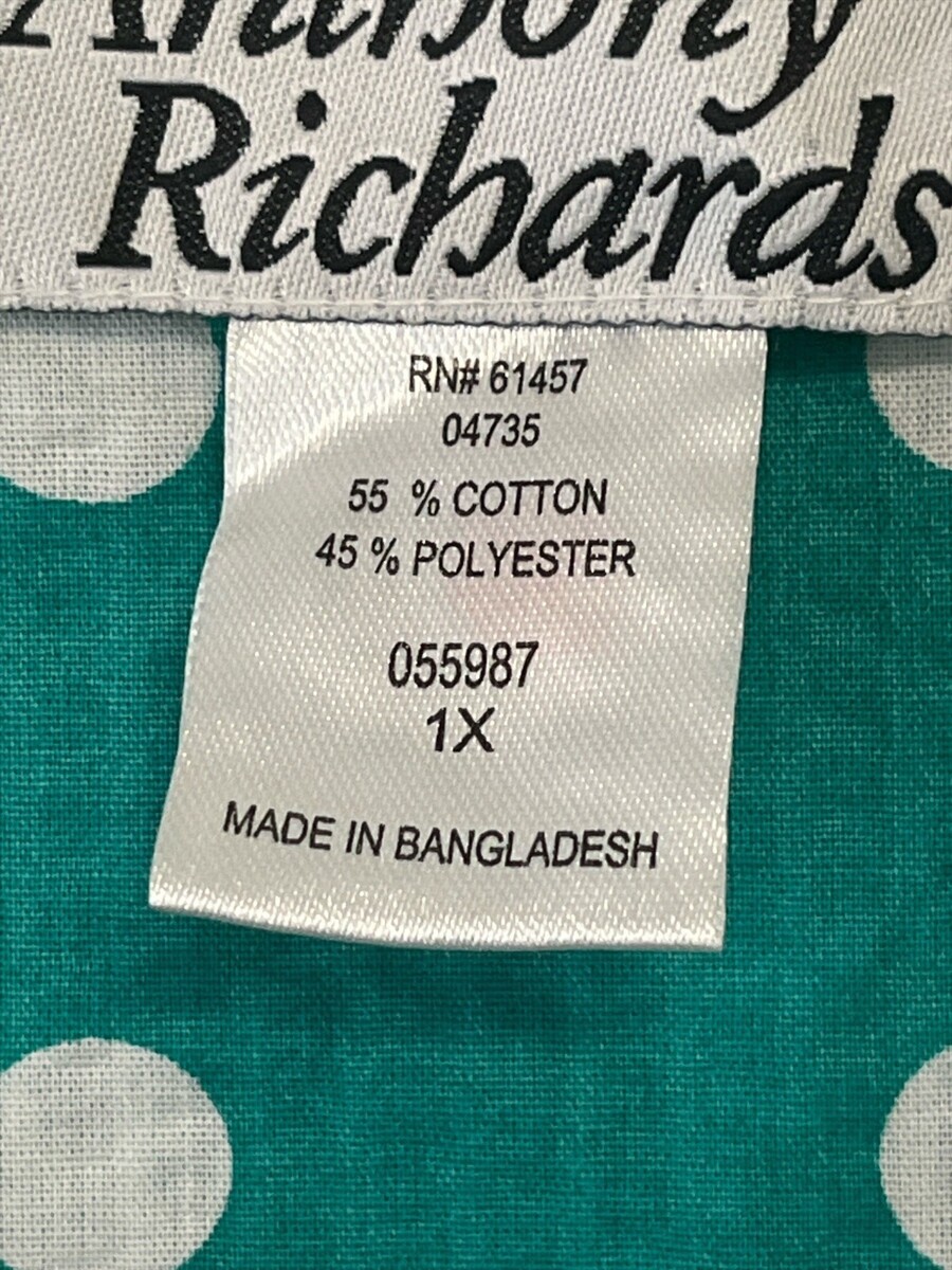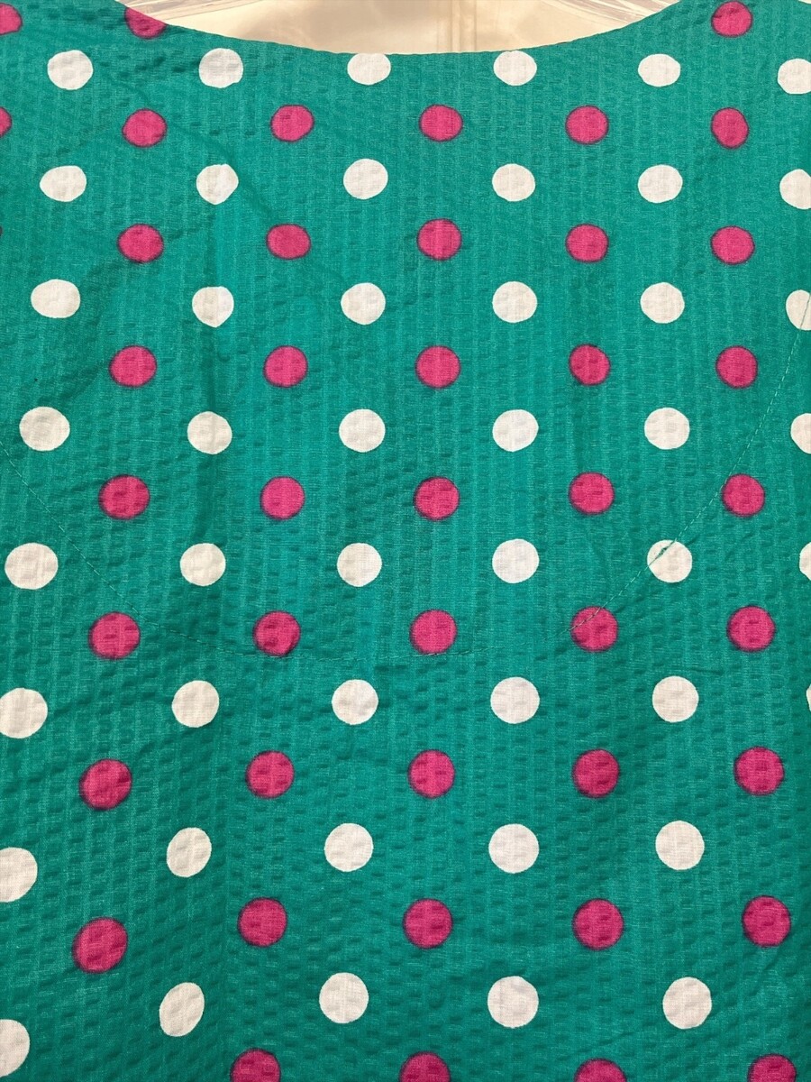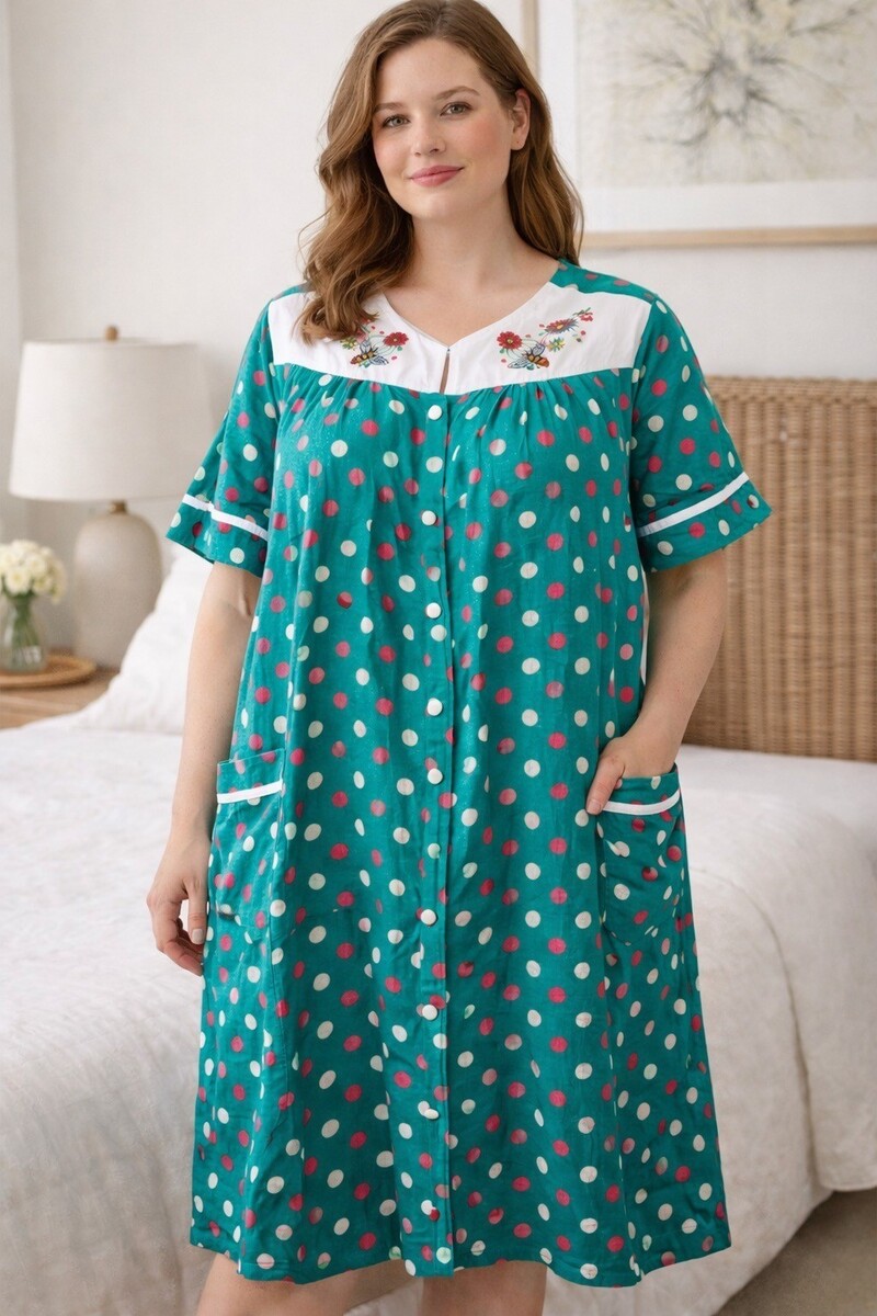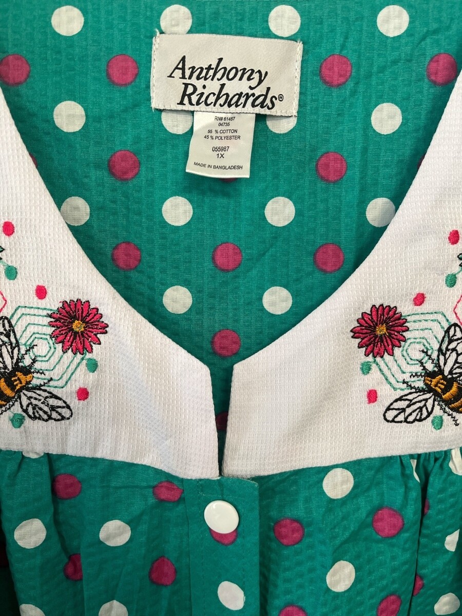 Vintage Anthony Richards house dress featuring a teal green base with pink and white polka dots, embroidered bee and floral detail at the neckline, and a relaxed pullover fit. Designed for comfort with roomy pockets and lightweight breathable fabric, this classic housedress is perfect for lounging, sleepwear, or nostalgic cottage-style wear.