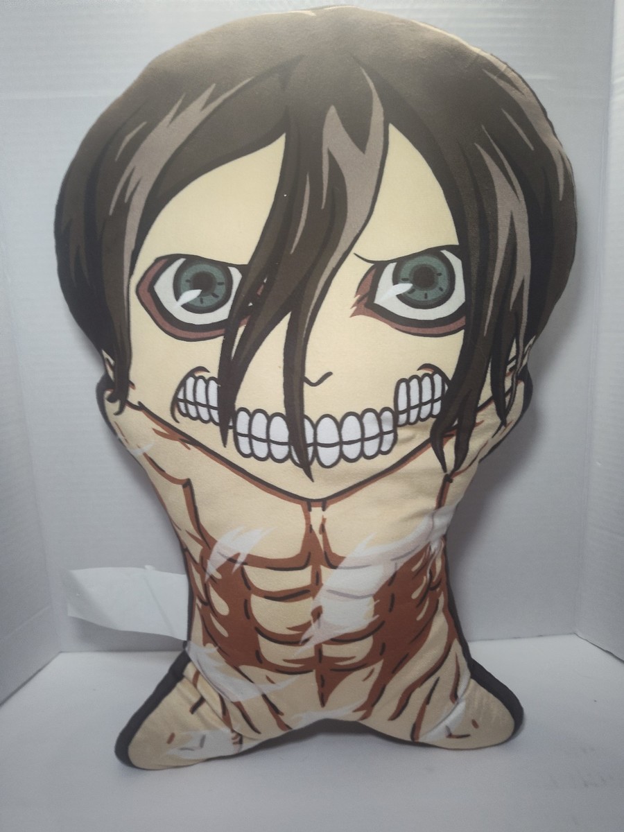Official Attack on Titan character pillow featuring Eren Yeager. This double-sided 20-inch plush pillow displays Eren on both sides and is perfect for anime fans and collectors.