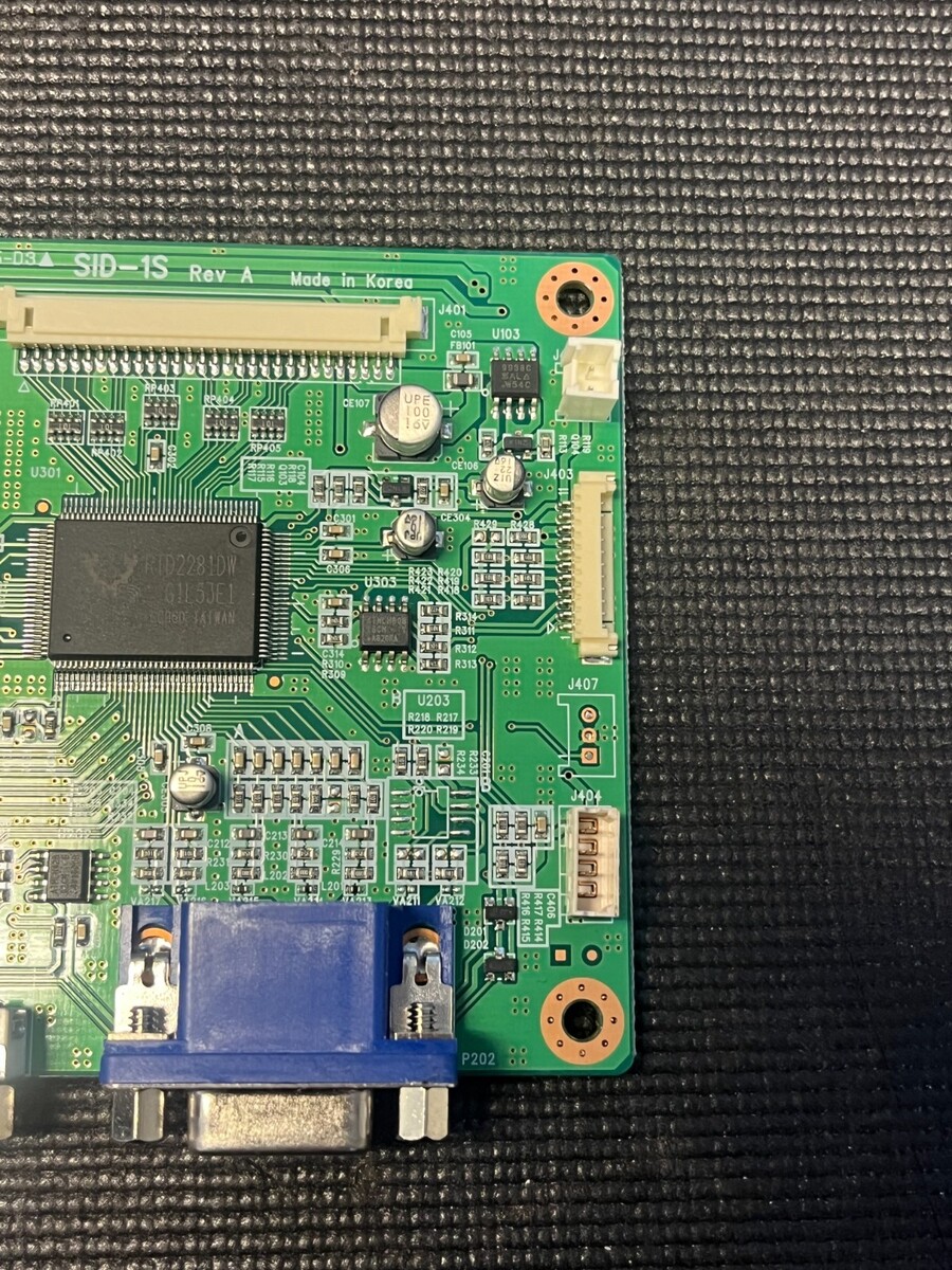 SID-1S slot machine display/video interface controller board with firmware D1S-SxG0-1.02DS1F, featuring VGA (DB-15), DVI-style, and flat-flex LCD connectors. Converts base game video signals to multiple display formats for player displays, bonus screens, or top monitors in modern video slots. Removed from working casino machine showing typical rack wear (dust, fingerprints) but no burnt components or broken connectors visible. Perfect for slot techs repairing IGT, Bally, Atronic, or similar video slot displays