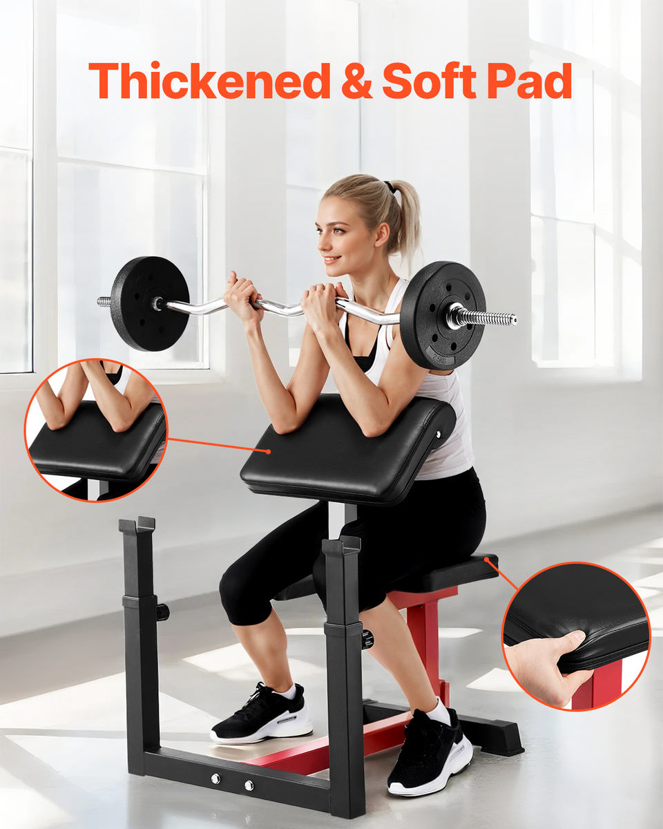 More Humanized Details: Built with a sturdy steel base, highly-elastic sponge padding, and non-slip foot pads, this bicep strength bench ensures enhanced stability, comfort, and safety during your workouts