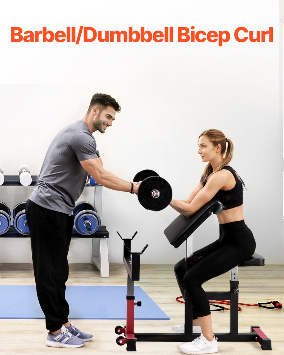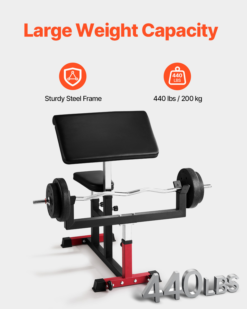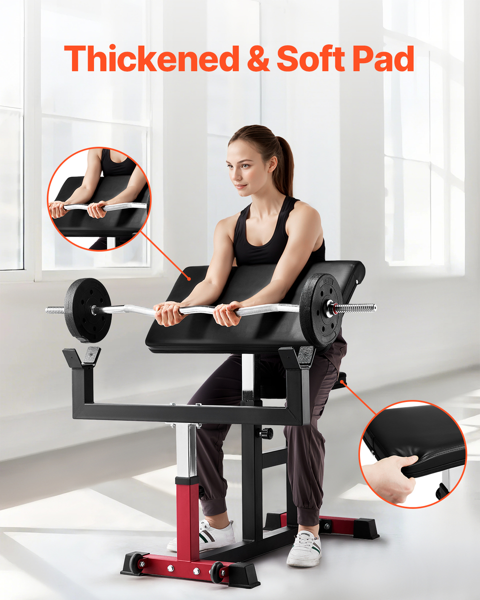 Customized Comfort Fit: Adjustable to match your body! This bicep curl machine features 5 seat positions, 5 barbell holder positions, and 7 arm rest positions for a tailored workout experience