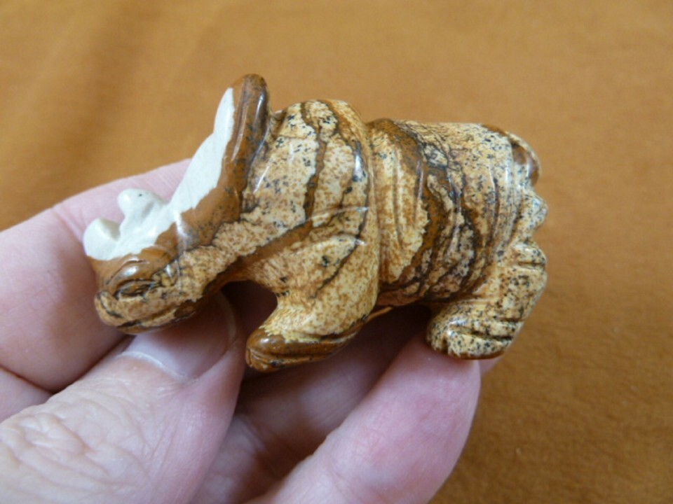 (internal #Y-RHI-734) Excellent carving of a RHINO, in polished, natural TAN WHITE PICTURE JASPER gemstone, 2-1/4" long, hand-carved in China. New, no defect. This is exactly the item you would receive. Great for the collector; also for firefighters, as the rhino is known to stamp out fires in the wild.
