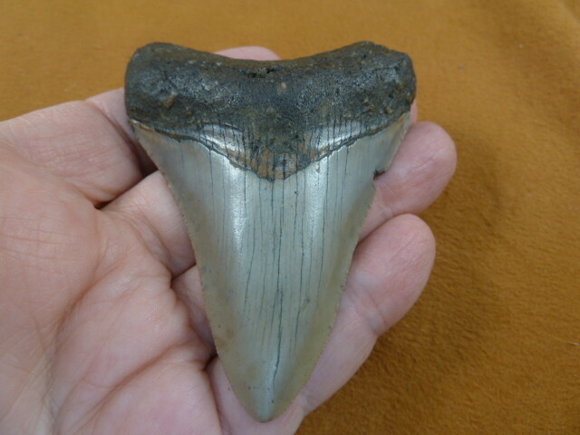 (internal #S-275-14) This is a 3-5/16" long (measured on the slant longest side), megalodon fossil shark tooth (coloring is natural from fossilizing in this color of sediment); solid specimen for a guy or gal (none of our teeth are repaired or restored, these are fully natural).