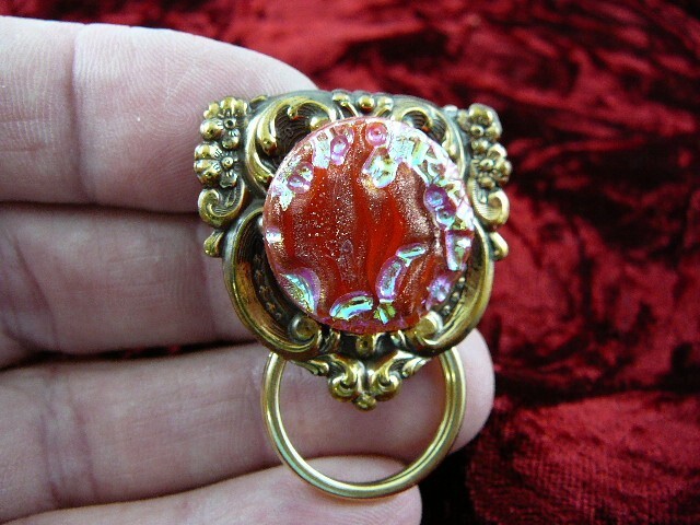 (Internal #E-300) This is a piece of repro Victorian brass with a flower design and a 1940's Czech iridescent red textured glass button, made into a pin/pendant brass eyeglass or ID badge holder, 1-3/4" long (includes loop). Clasp pin/pendant glued on back horizontally. Excellent detail and texture on the brass.