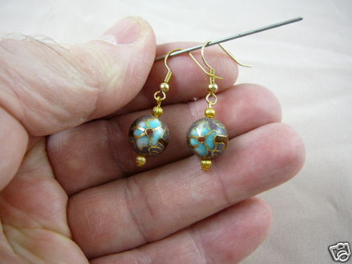 CLOISONNE EARRINGS, CHINA: Here's how a cloisonne bead is made: A copper body is hammered and welded. Then wire "cells" (where the word "cloisonne" came from) are formed and soldered on the copper body. Preliminary enamel filling and firing is completed (numerous colors of enamels are used in a single bead). Then 3 or more thin layers of enameling are filled and fired (never a heavy layer since it will bubble up and burn). Grinding off of excess enamel is done, then preliminary polishing, then final polishing. Finally, 24 k gold electroplating is done to complete the gilding of the cloisonne bead, which adheres to all the brass wired "cells" to make a beautiful work of art in each bead!
