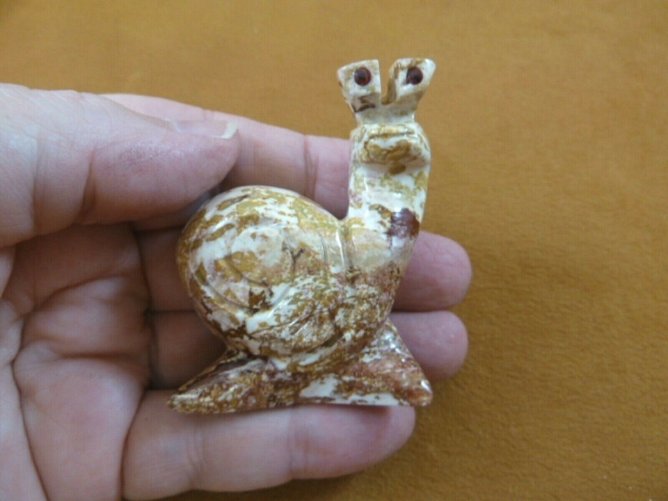 (Internal #Y-SNAI-411). Cute, medium soapstone TAN RUST RED WHITE GRAY racer snail, 2-1/4? tall x 7/8? wide x 1-3/4? long, carved in Peru of native soapstone. Marbled color is natural. New, no defect.