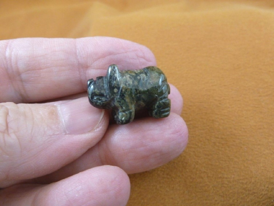 (internal #Y-RHI-524) Excellent carving of a tiny RHINOCEROS, in polished, natural GREEN BLACK JASPER gemstone, he measures 1" long x 5/8" tall, hand-carved in China. New, no defect.