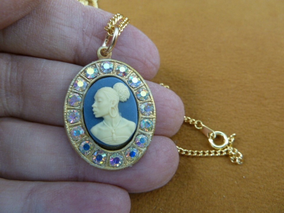 (Internal #CA30-162) Excellent side-view cameo of an African-American woman. New, molded from resin, this is a small cameo brass pendant in OFF-WHITE color with PURPLE-BLUE color background, mounted on - - brass with WHITE Austrian crystal accents, pendant.