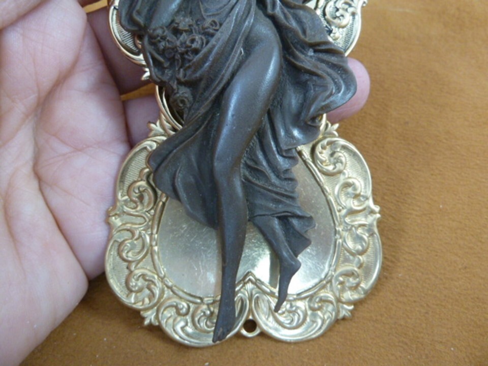 (#CXL1-3) You are bidding beautiful, CAMEO of a FULL BODY ANGEL WOMAN, measures 4-5/8" tall x 2-3/4" wide, organic pine resin cameo has been hand molded from the shell original in Chocolate brown color On double heart brass, antiqued; clasp pin/pendant glued horizontally on back (see last photo for example).