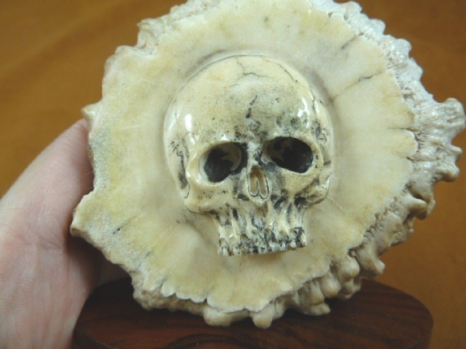 (#Skull-10) Beautifully hand crafted, exquisitely detailed smooth, SMALL Skull (no lower jaw) carved in bas relief, carved of shed moose slice of ?button? (base, pedicle), on wood base. No carving on reverse.