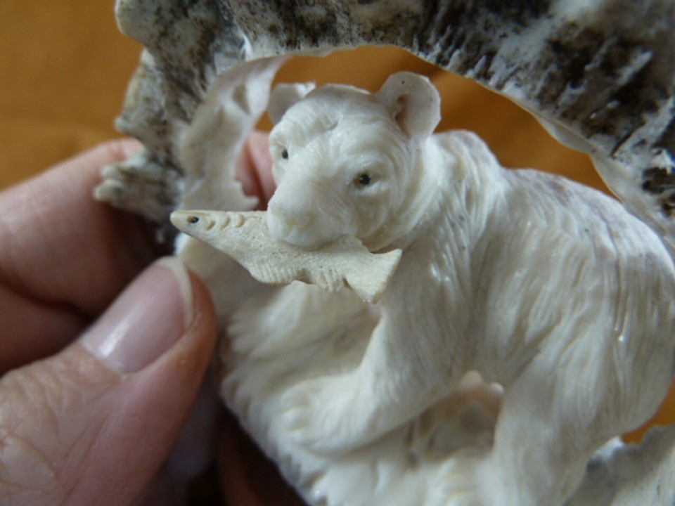 bear-w105 grizzly bear w/ fish of shed ANTLER figurine Bali detailed carving