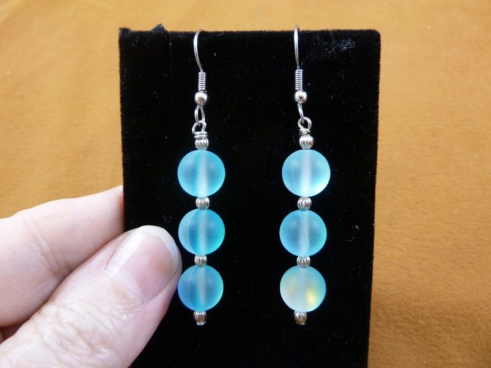 (Internal #EE390-83) This is a beautiful pair dangle earrings, round white with blue flashes/yellow synthetic moonstone 10mm beads with silver alloy accent beads and hypoallergenic French wires.